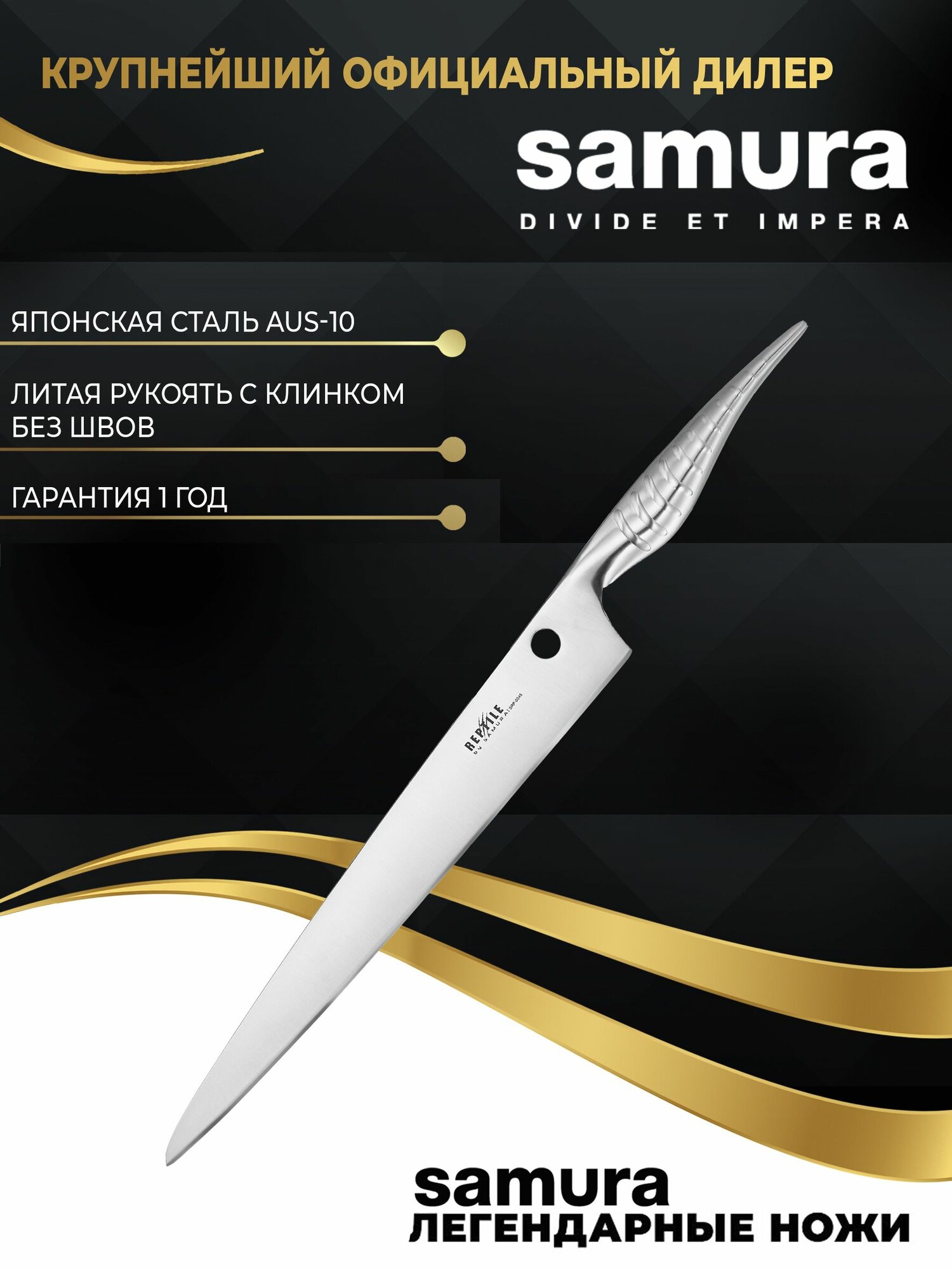 Ниже Вы можете прочитать отзывы на Нож кухонный для нарезки (слайсер) Samura REPTILE, 274 мм (SRP-0045/K), ознакомится с подробными характеристиками, посмотреть интересные обзоры и фотографии на Нож кухонный для нарезки (слайсер) Samura REPTILE, 274 мм (SRP-0045/K).