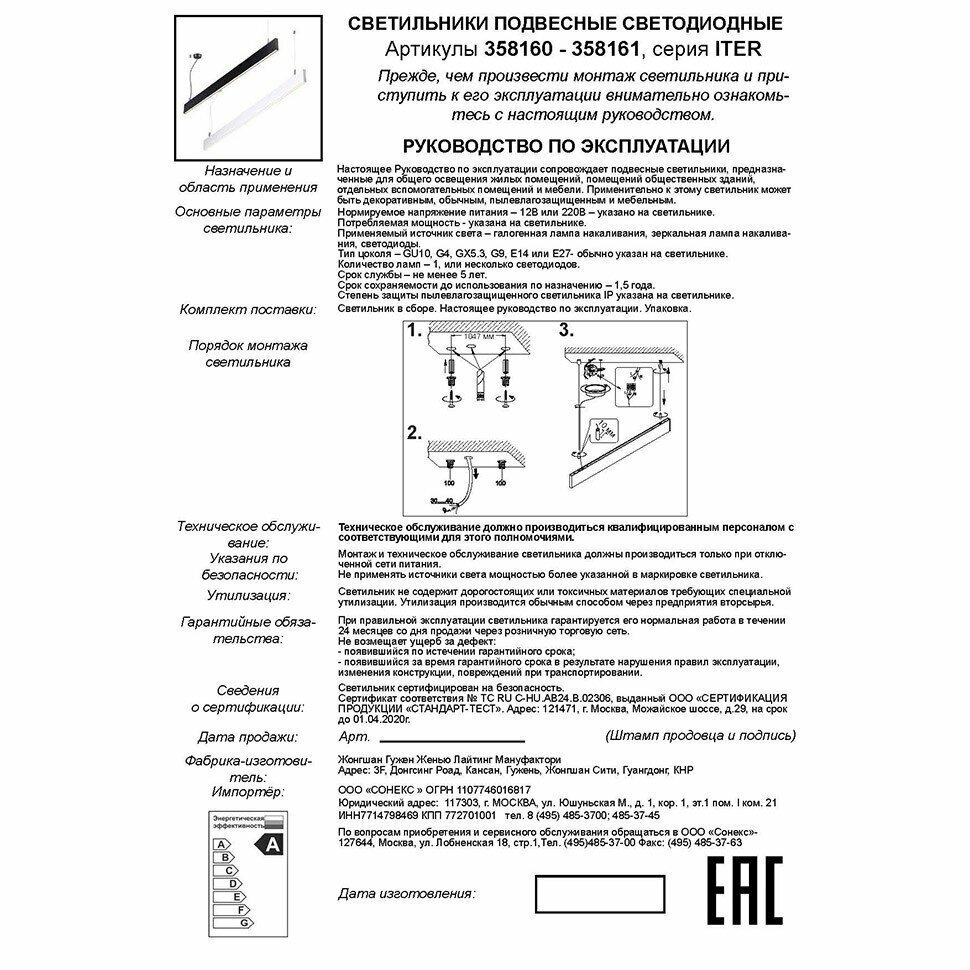 | Дополнительная информация | Подвесной светодиодный светильник в стиле Модерн 358161 из серии «Iter» от производителя Novotech (Венгрия). Цвет: черный. Форма плафонов - прямоугольные. Используемые материалы: металл. Цоколь LED, количество ламп - 1 шт., мощность одной ламочки 40 Вт. Цветовая температура 4000K, световой поток 3240 люмен. Степень пылевлагозащиты ip20. Напряжение 220V. Размеры: длина 1198 мм, ширина 18,05,2019 мм, высота 80 мм. |