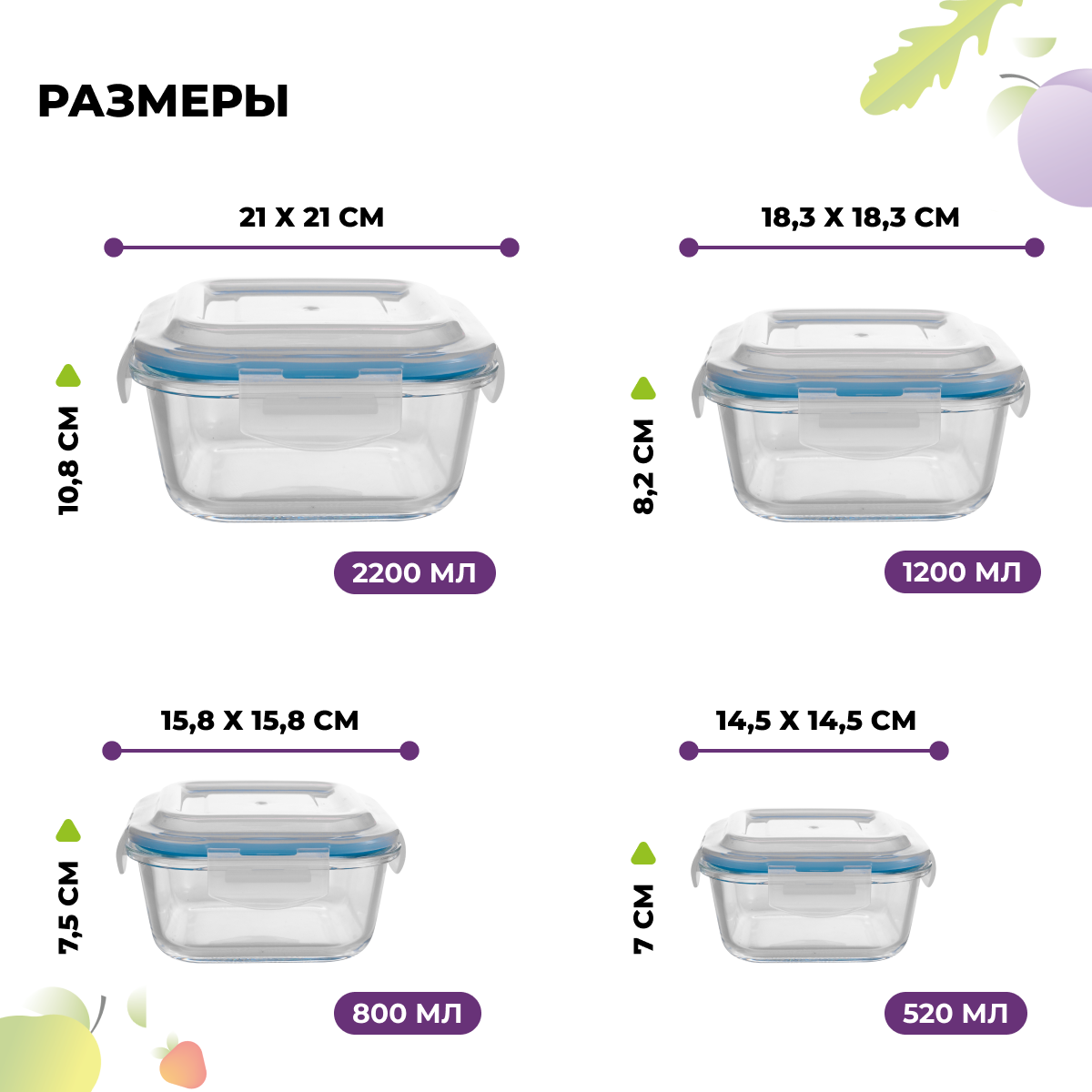 СохранитьКонтейнеры для хранения еды ELEY стеклянные герметичные с крышками, набор 4 шт: 520мл, 800мл, 1200мл, 2200мл интересное: