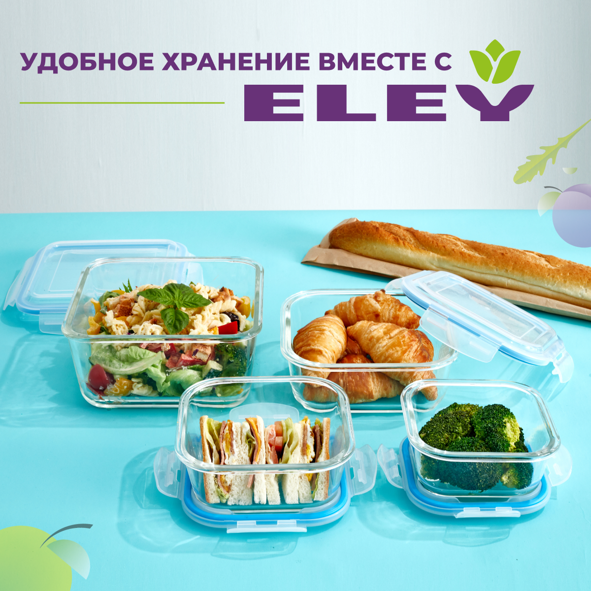 Набор контейнеров для еды Eley из жаропрочного стекла 2 шт, 450 мл и 1030 мл