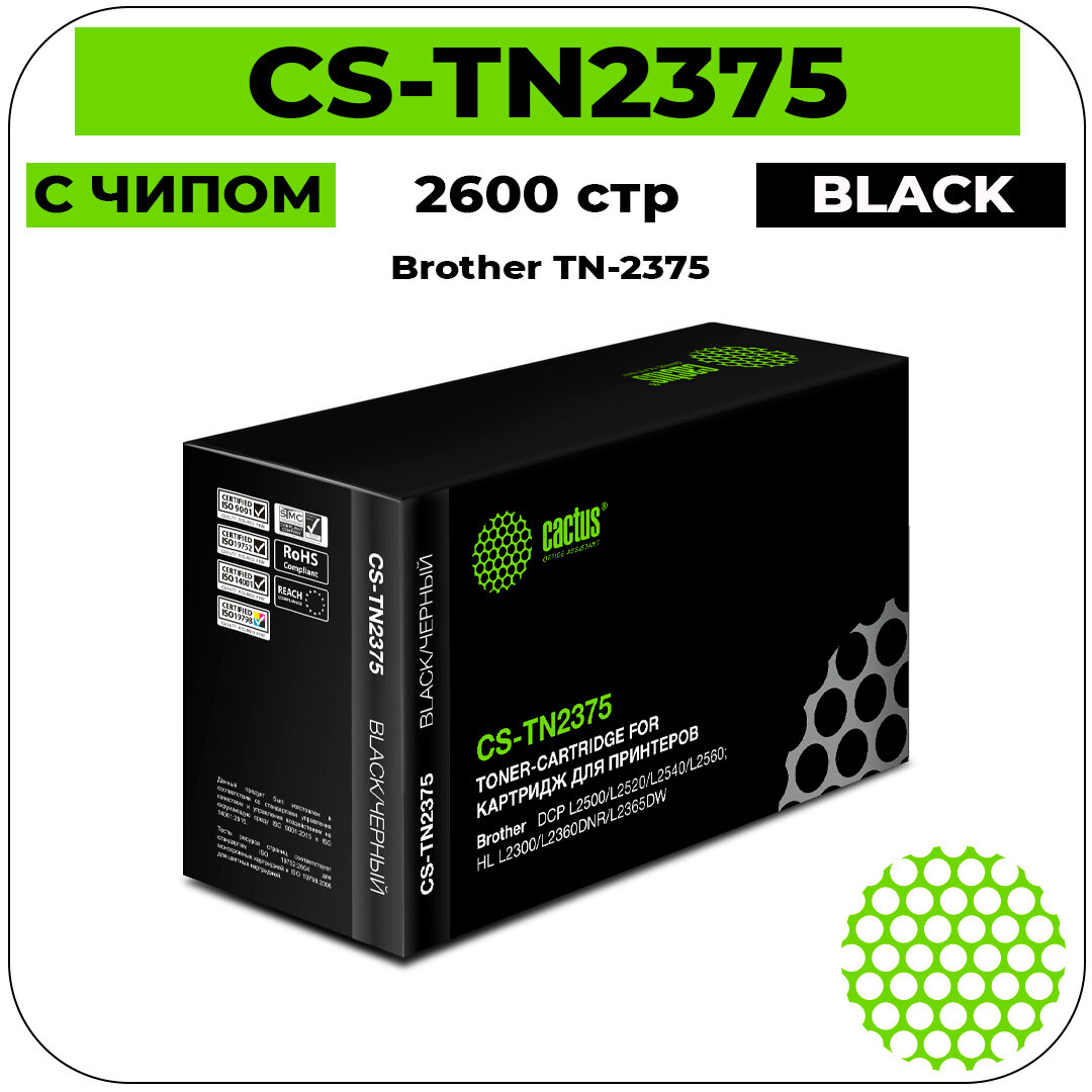 Картридж Cactus CS-TN2375, черный, 2600 страниц, совместимый для Brother HL-L2300DR, HL-L2340DWR, HL-L2360DNR, HL-L2365DWR, DCP-L2500DR, DCP-L2520DWR, DCP-L2540DNR, DCP-L2560DWR, MFC-L2700DWR, MFC-L2720DWR, MFC-L2740DWR