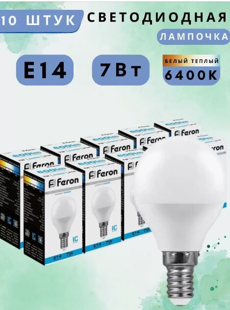 Светодиодная лампа Feron LB-95, 7Вт, 230В, E14, 6400К, G45, 10 штук