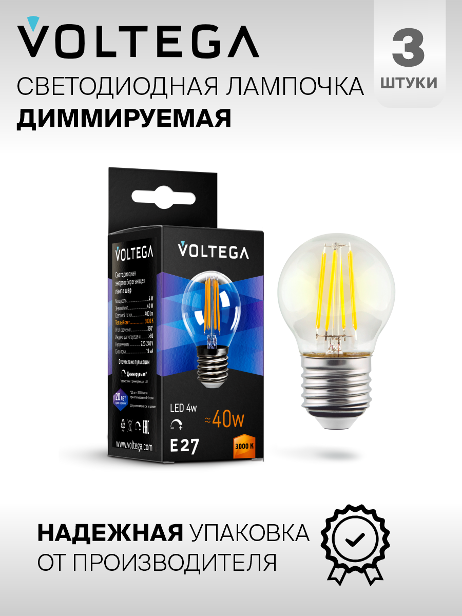 Лампочка светодиодная E27 форма шар 5W нейтральный белый свет Voltega Crystal Globe 4000K упаковка 3 штуки диммируемая