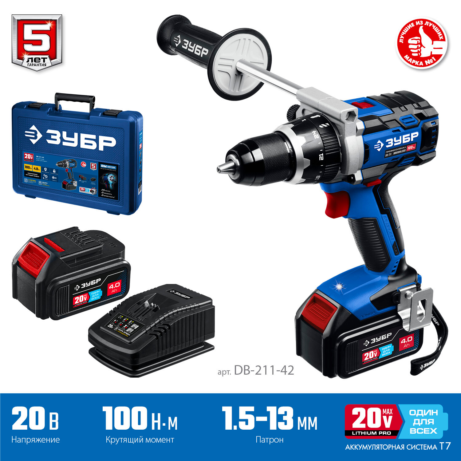 Купить ЗУБР Т7, 20 В, 100 Н·м, 2 АКБ (4 А·ч), бесщеточная дрель-шуруповерт, кейс, Профессионал (DB-211-42)