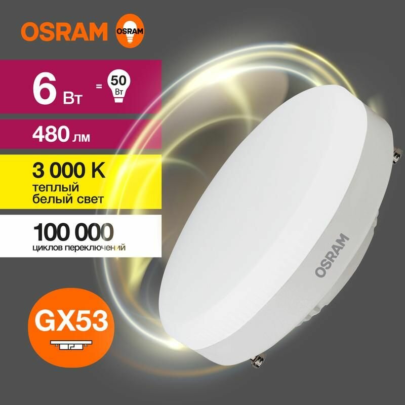 Лампа светодиодная OSRAM LED Value GX, 480лм, 6Вт, 3000К, теплый свет, Цоколь GX53, колба GX, таблетка