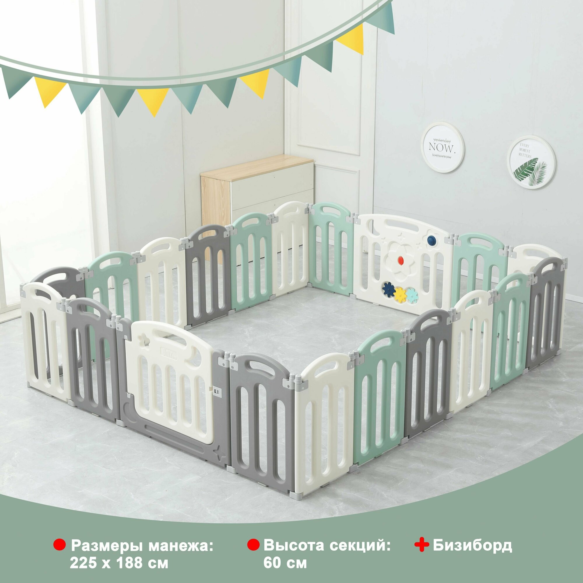 Манеж UNIX Kids "Simple" Color,серый/белый/зеленый, 225х188, большой детский игровой манеж из пластика, игровой комплекс для дома, для улицы