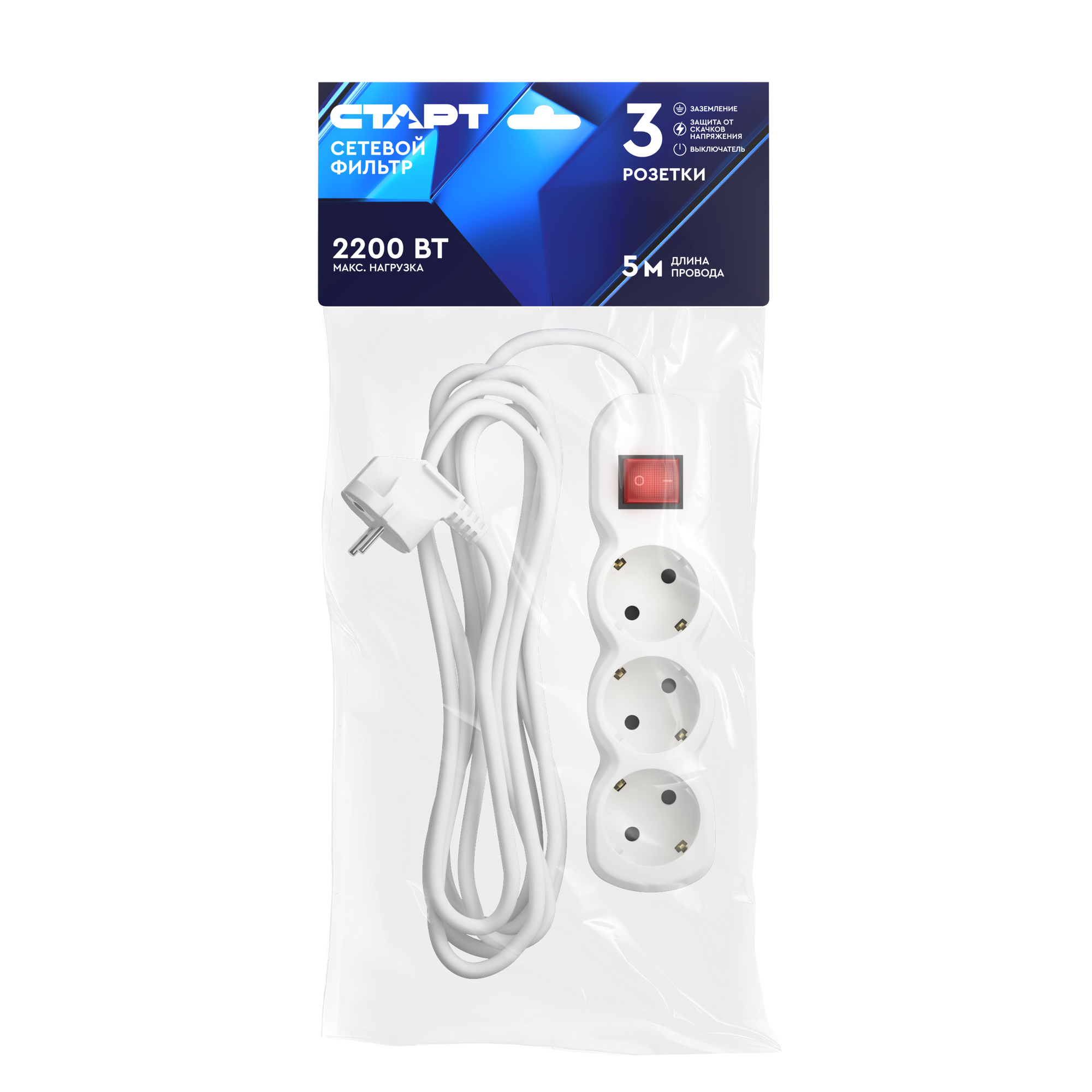 Удлинитель сетевой бытовой 5м старт 3 розетки с выключателем, 10А, ПВС 2х0.75, 2200 Вт