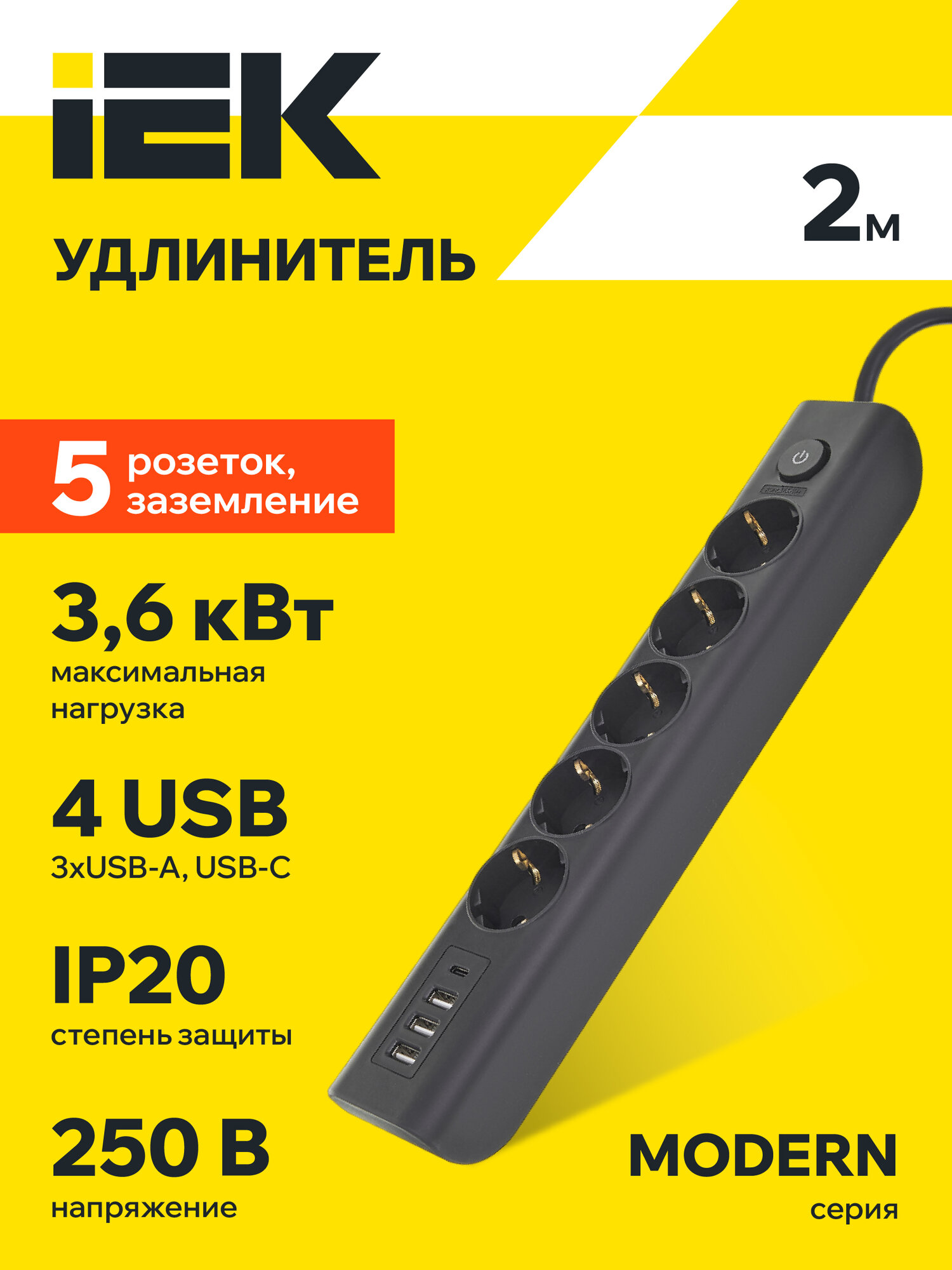 MODERN Удлинитель бытовой с выключателем 2 метра, 5 розеток, 3хUSB-A + USB-C, 16А, черный IEK