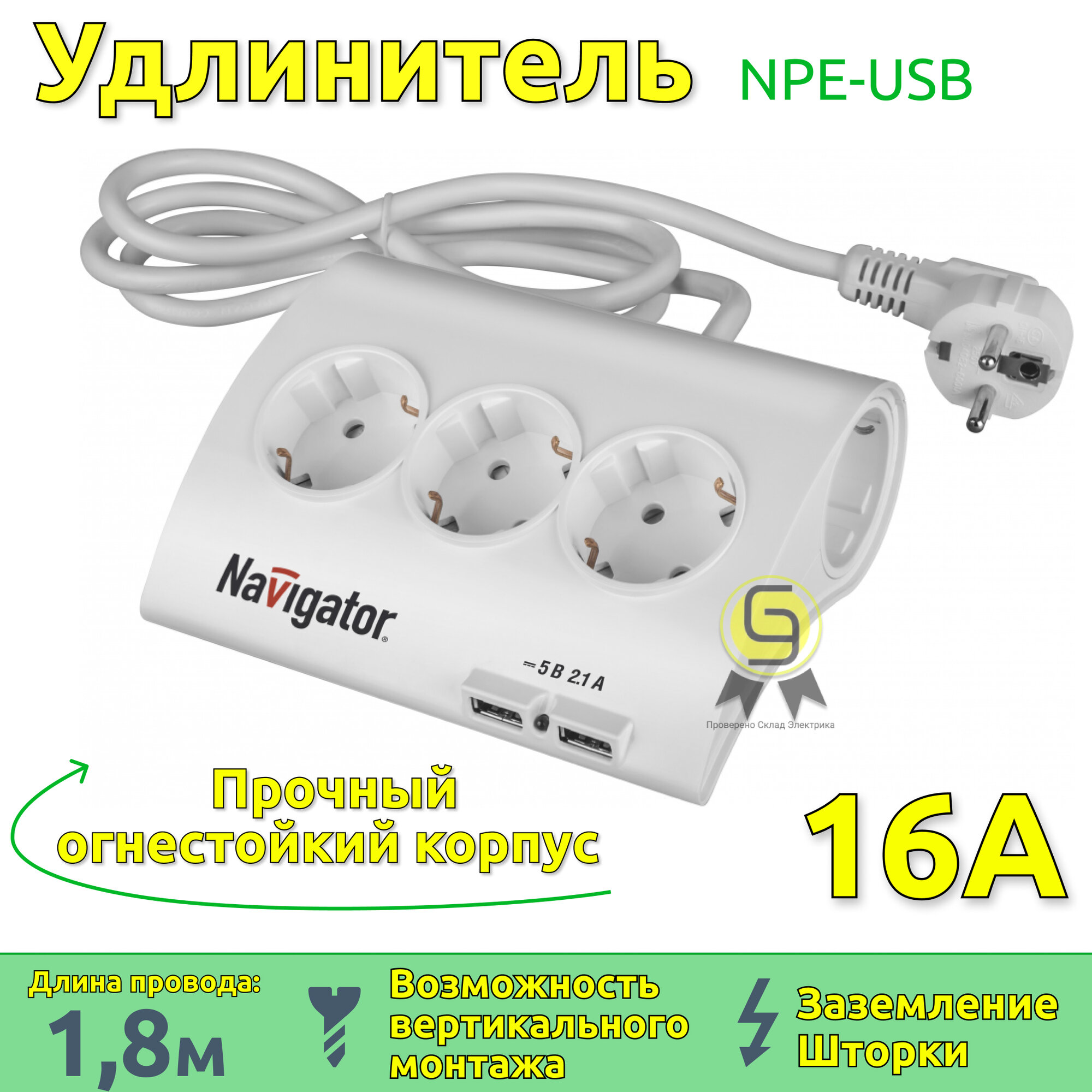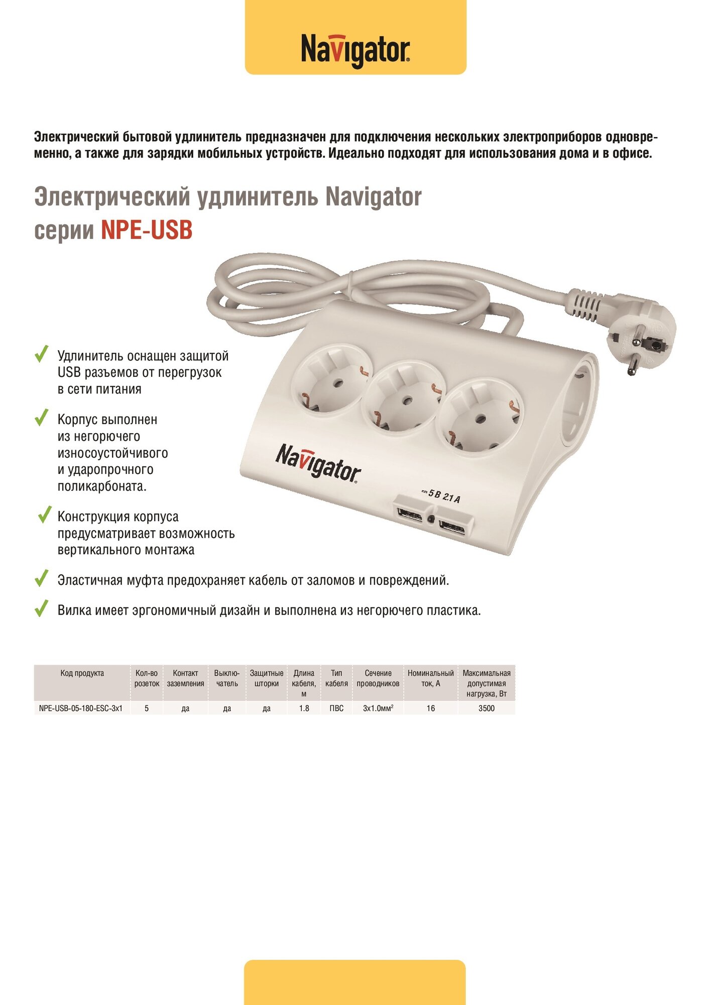Удлинитель бытовой 5 гнезд, 1.8 м, USB разъем, Navigator, NPE-USB-05-180-ESC-3X1, 71544