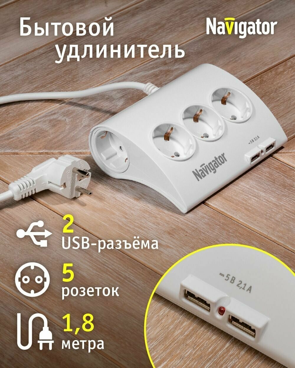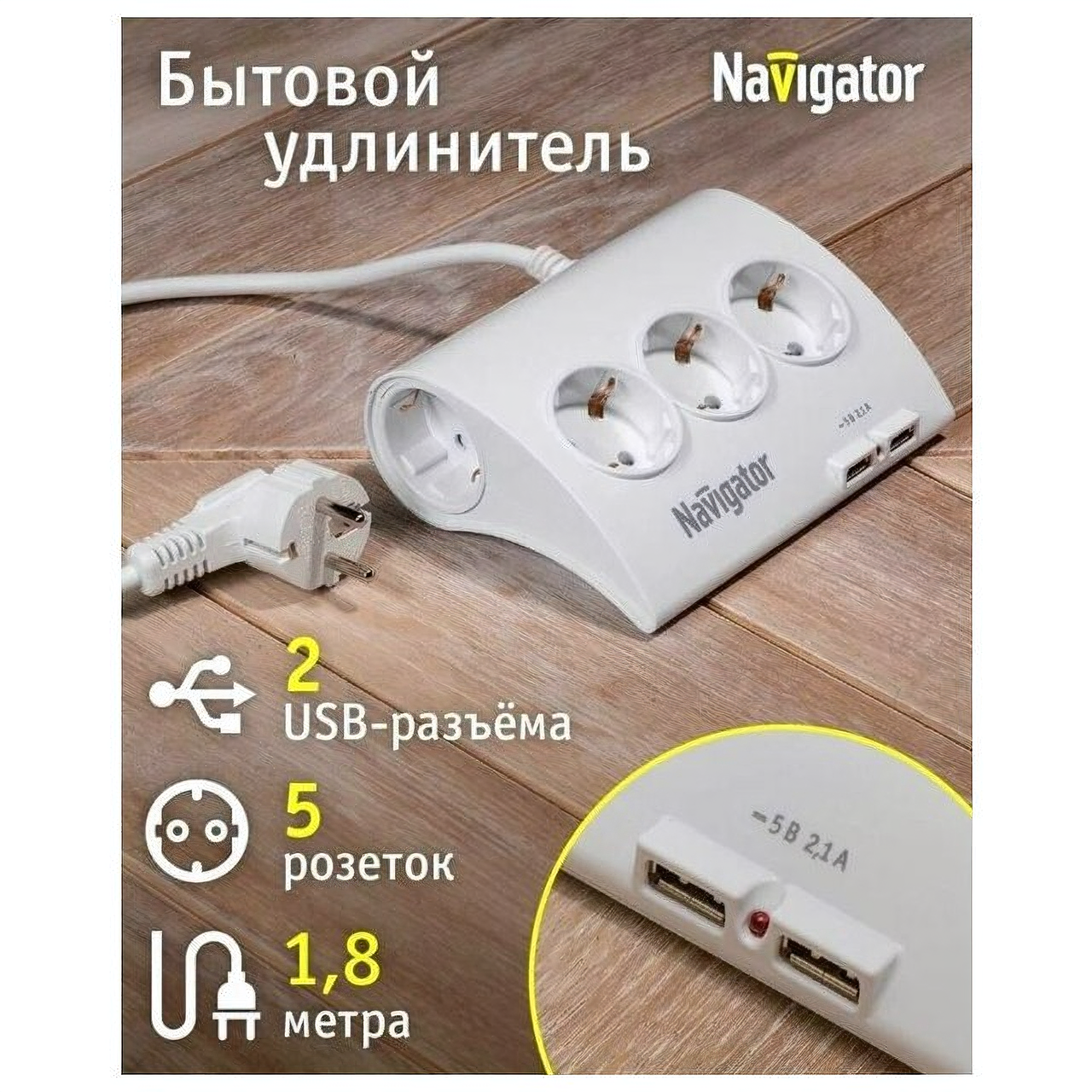 Купить Удлинитель бытовой Navigator 71 544, с выкл., 5 розеток, с зазем., 2 USB-разъема, 1.8 м