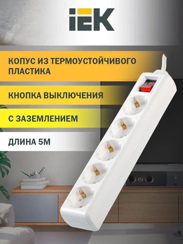 Удлинитель с выключателем IEK У05К-выкл, ПВС 3 x 1 мм², с заземлением, 5 розеток, 5 м, белый
