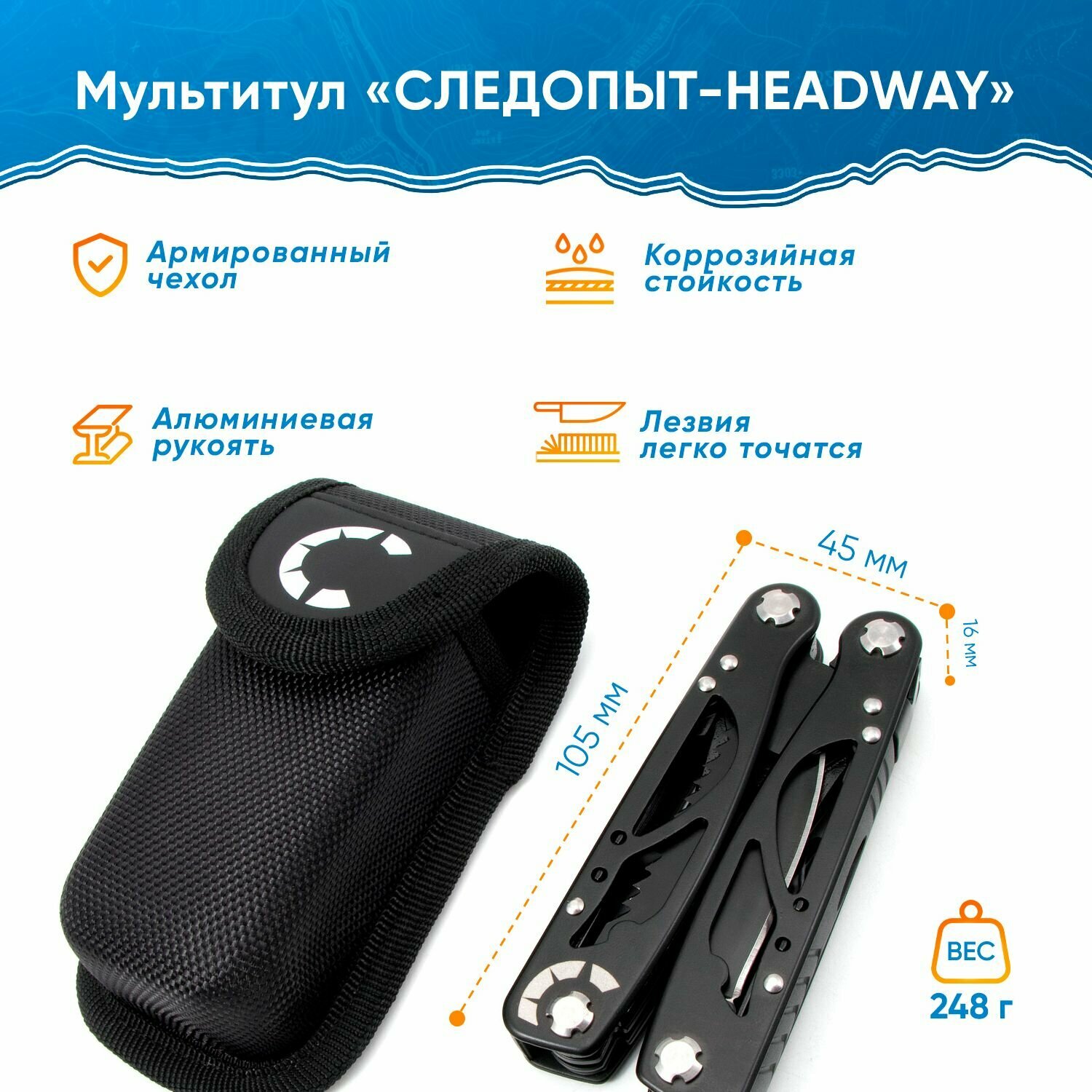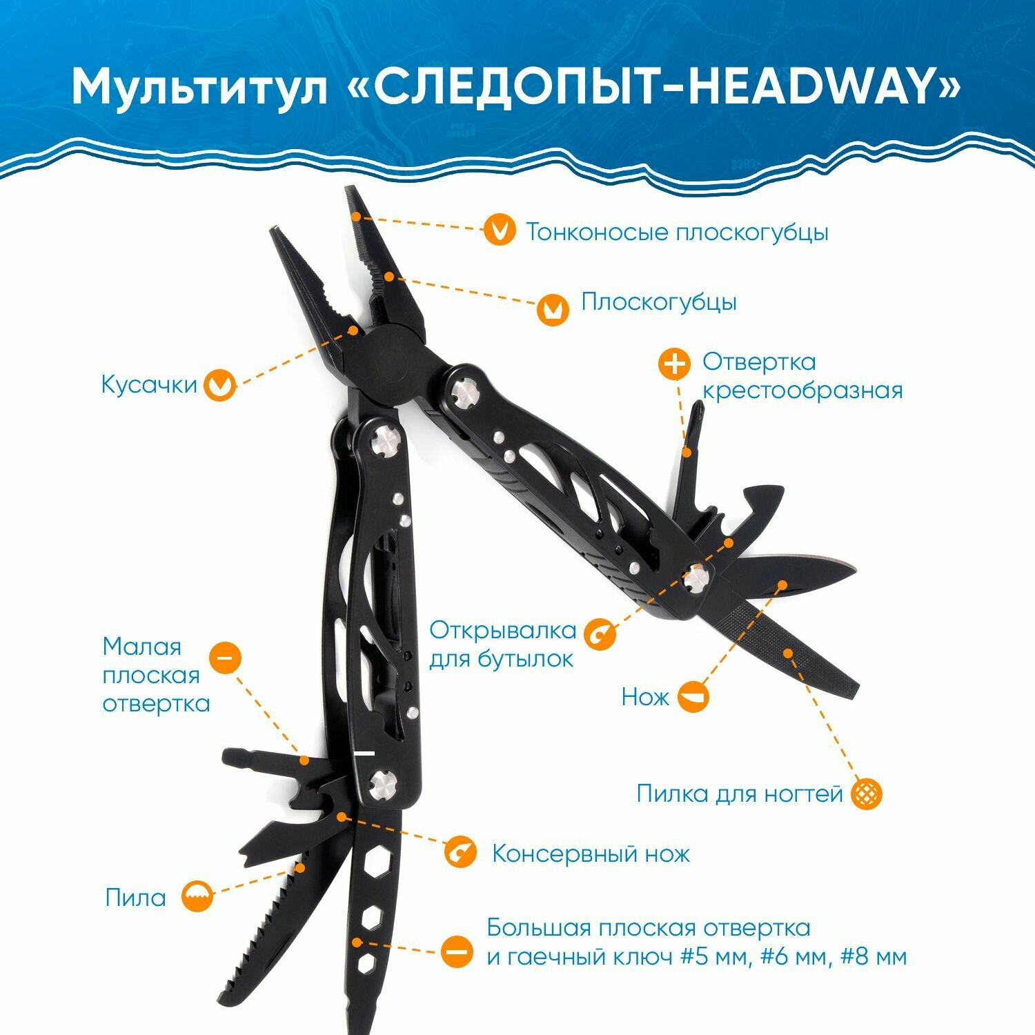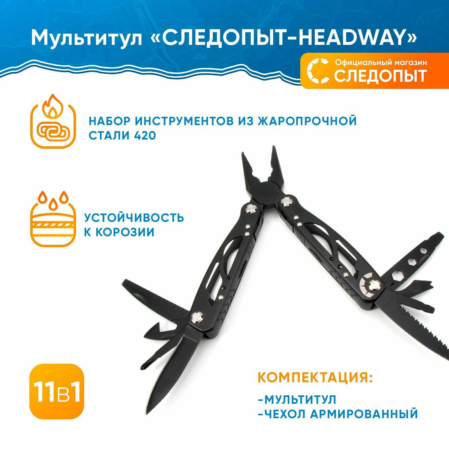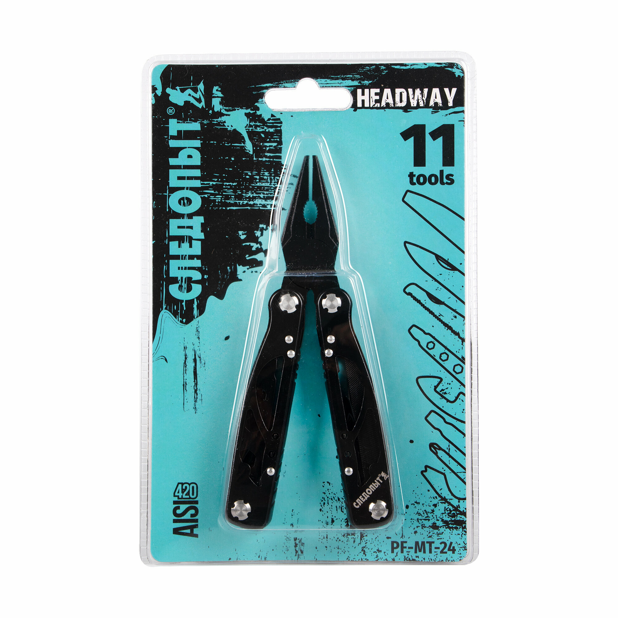 Мультитул (плоскогубцы) Следопыт -HEADWAY, 105х45х16 мм, 11 предметов, в чехле, на блистере