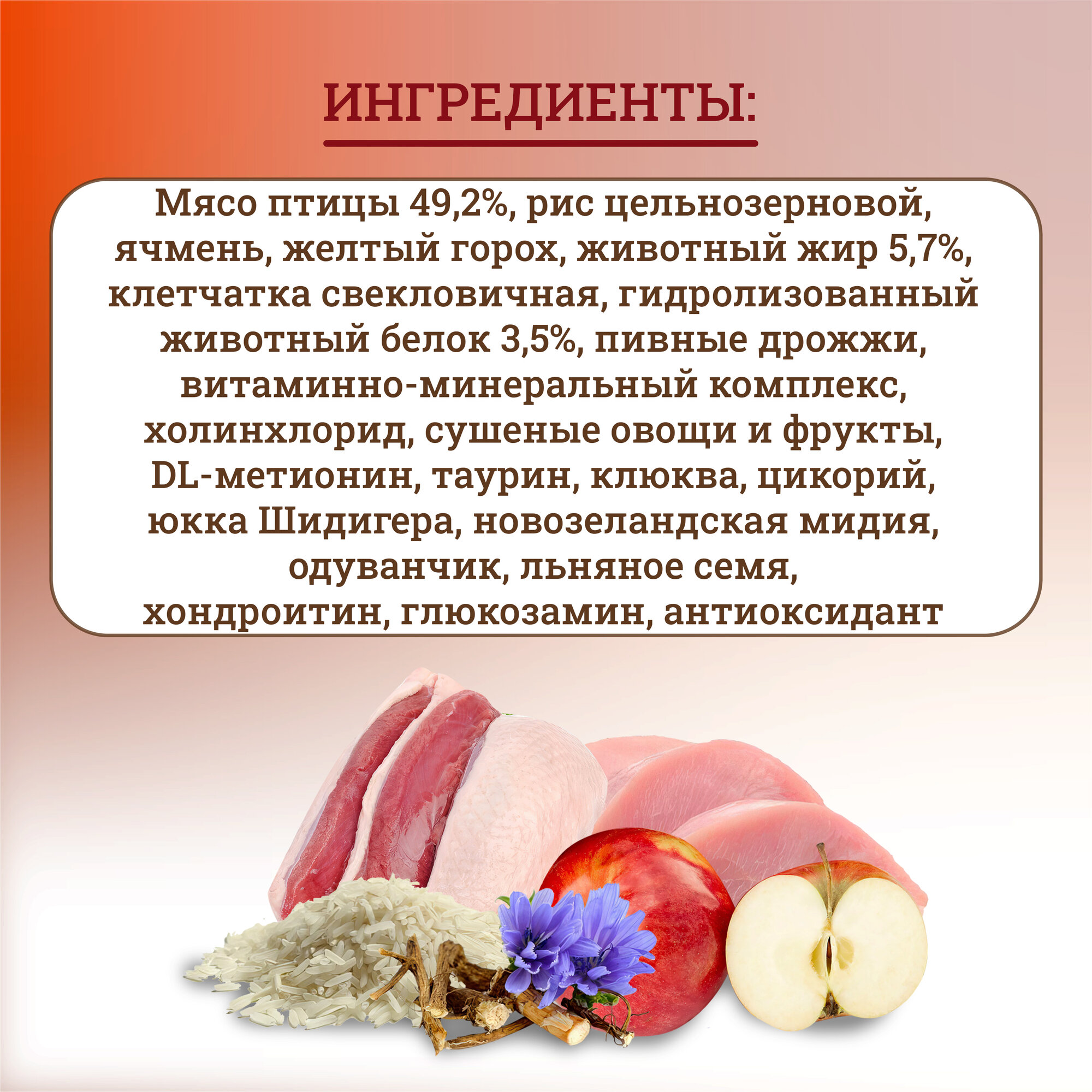 | Состав | дегидрированное мясо курицы 37 %, маис цельнозерновой, маисовый протеин, рис, жир куриный (источник Омега-6 жирных кислот), свекольная пульпа, гидролизованная и дегидратированная печень 2,5 %, яблоки, дрожжи (источник маннанолигосахаридов), витаминно-минеральный комплекс, рыбий жир (источник Омега-3 жирных кислот), таурин, топинамбур (источник фруктоолигосахаридов), клюква, антиокислитель, экстракт юкки Шидигера |