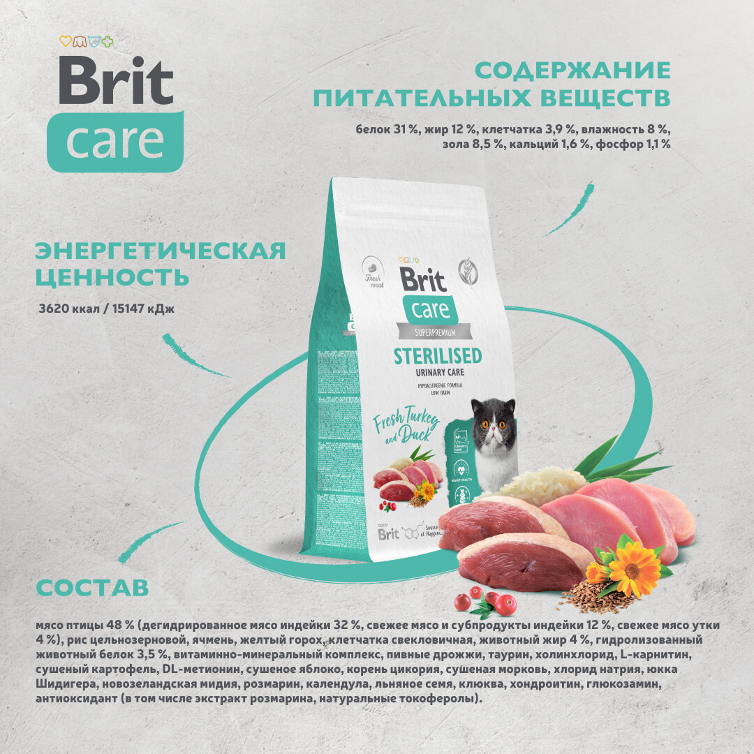 Сухой корм Brit Care Cat Sterilised Urinary Care для стерилизованных кошек, с индейкой и уткой, 1.5 кг