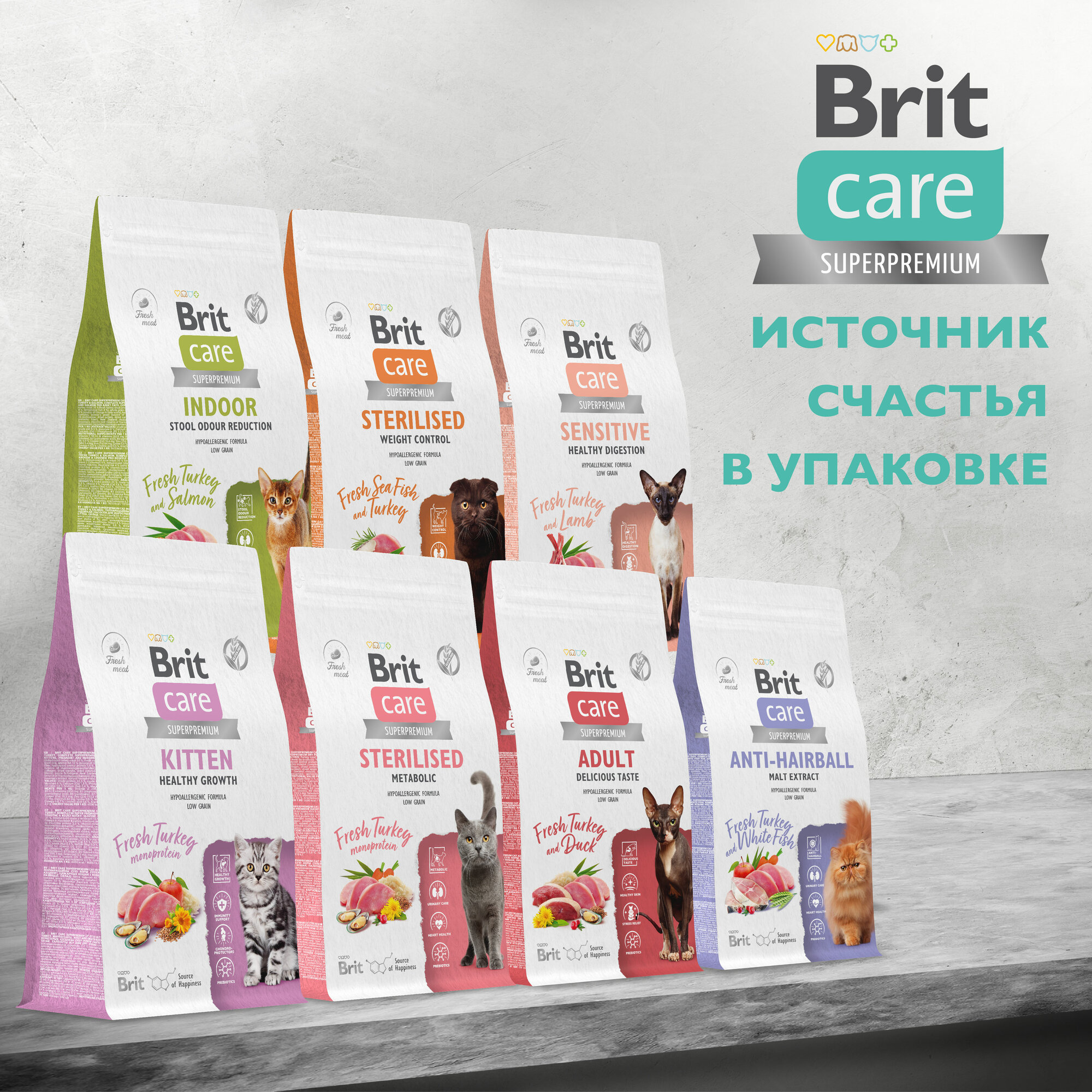 Сухой корм для взрослых домашних кошек супер-премиум с индейкой и лососем "Cat Indoor Stool Odour Reduction"BRIT CARE 1,5 кг