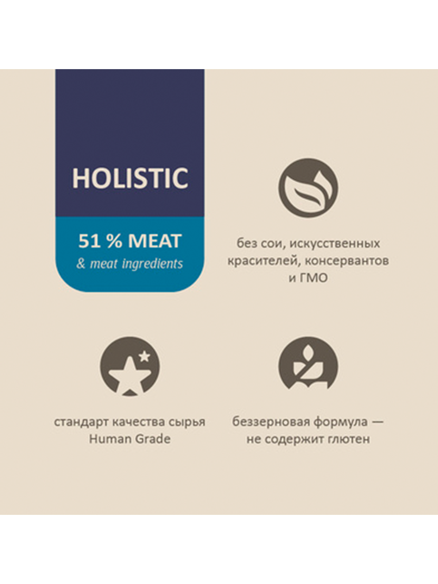 | Состав | мясо (в т.ч. индейка 30 %, кролик 8 %), картофель, зелёный горошек, жир индейки, витаминно-минеральный комплекс, пивные дрожжи ,цельное яйцо, пульпа сахарной свёклы, льняное семя, тыква, морковь , лососёвый жир,брусника, L-карнитин, ромашка, розмарин, цикорий, таурин, глюкозамин из животных тканей, сульфат хондроитина, юкка Шидигера |