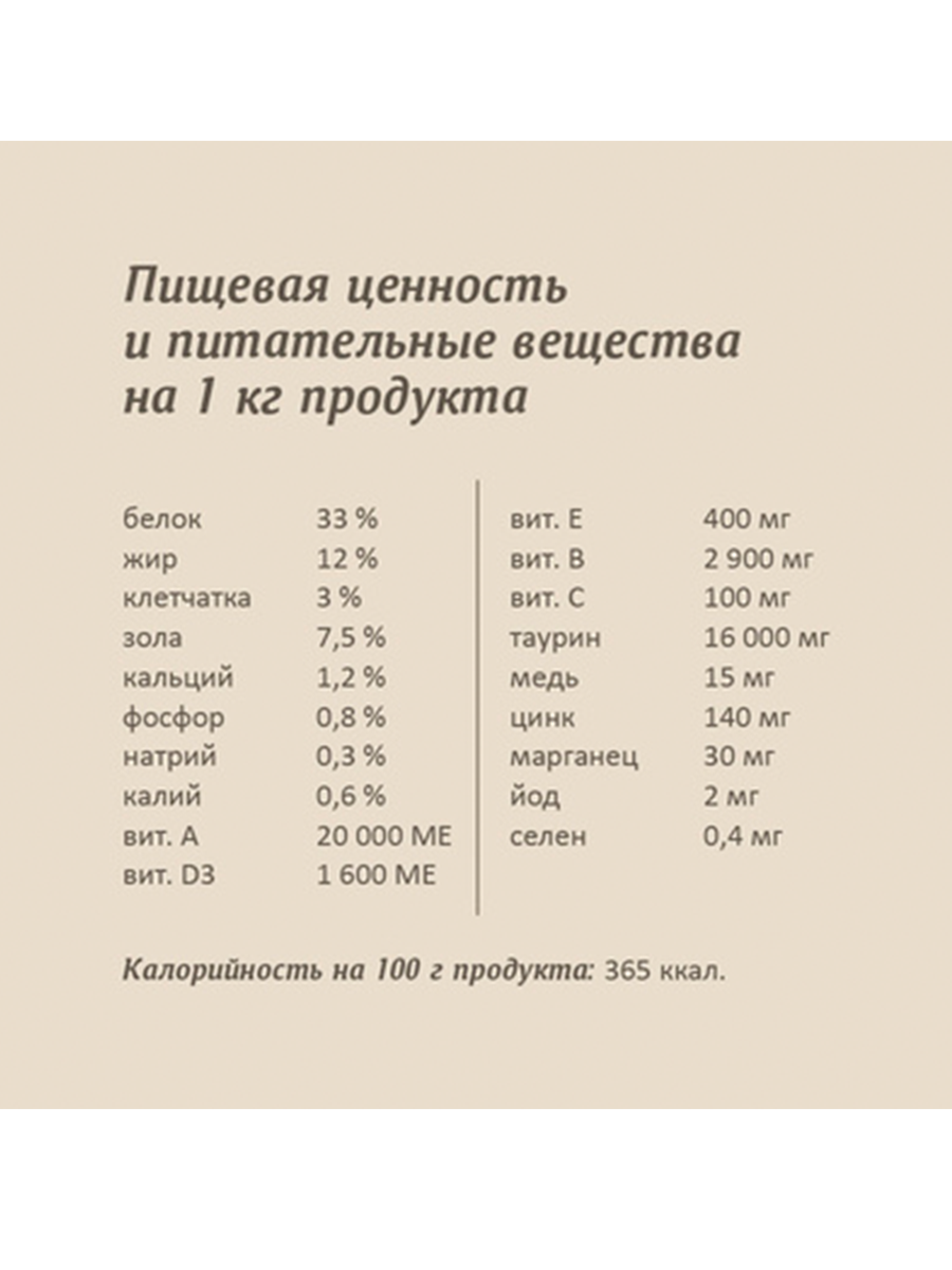 | Пищевая ценность | сырой белок 34%, сырой жир 12%, сырая клетчатка 3%, сырая зола 7%, кальций 1,3%, фосфор 0,8%, натрий 0,3%, калий 0,6% |