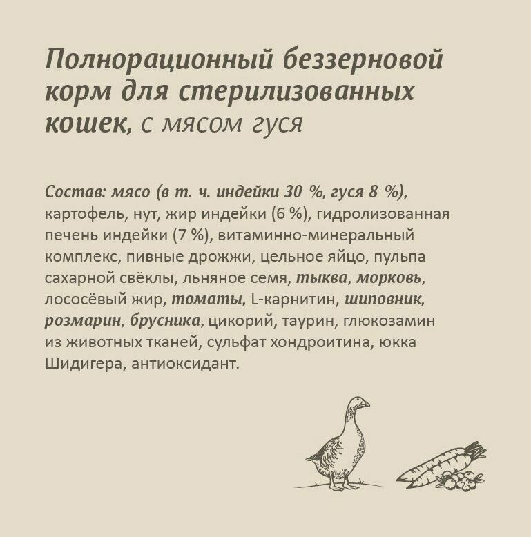 Cухой корм для стерилизованных кошек SAVITA, беззерновой класса HOLISTIC со свежим мясом гуся, морковью и тыквой, 400 грамм.