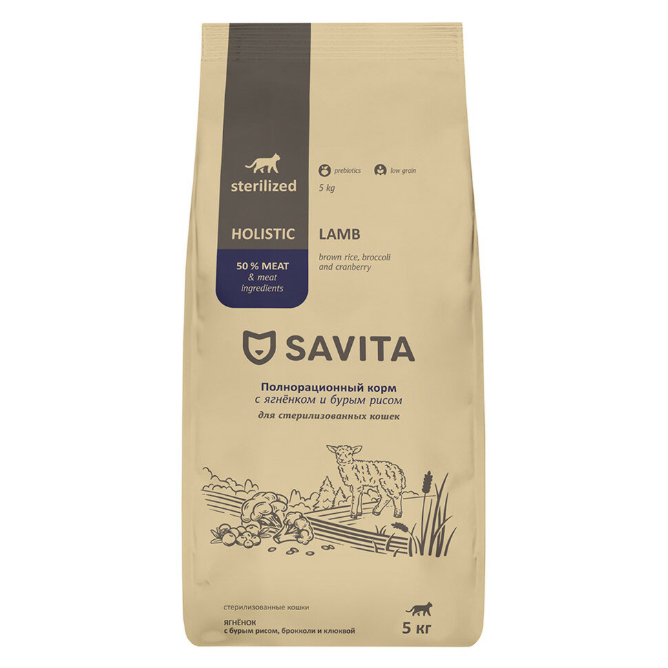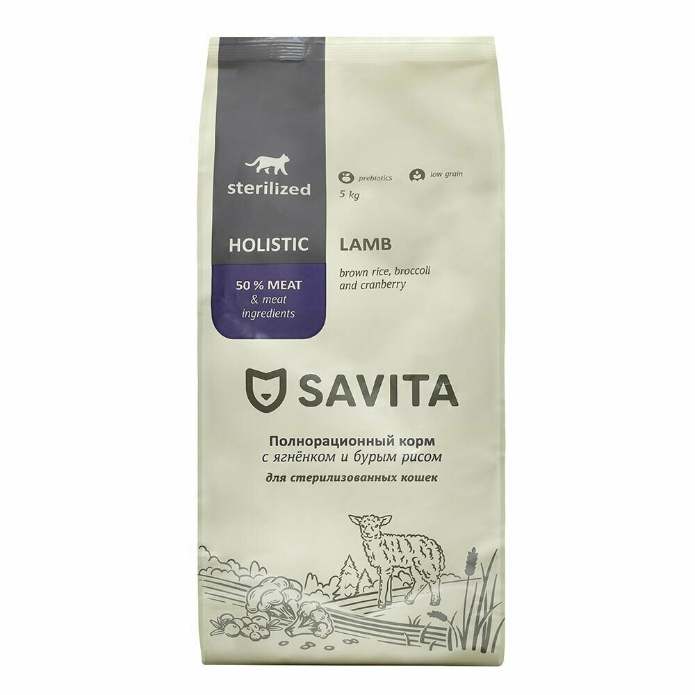 Сухой корм SAVITA для стерилизованных кошек с ягненком и бурым рисом, STERILIZED ADULT Skin&Coat Care, Lamb & Brown rice, 5 кг
