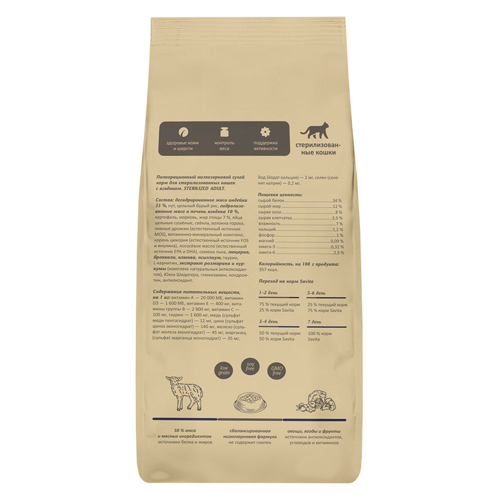 Сухой корм SAVITA для стерилизованных кошек с ягненком и бурым рисом, STERILIZED ADULT Skin&Coat Care, Lamb & Brown rice, 2 кг
