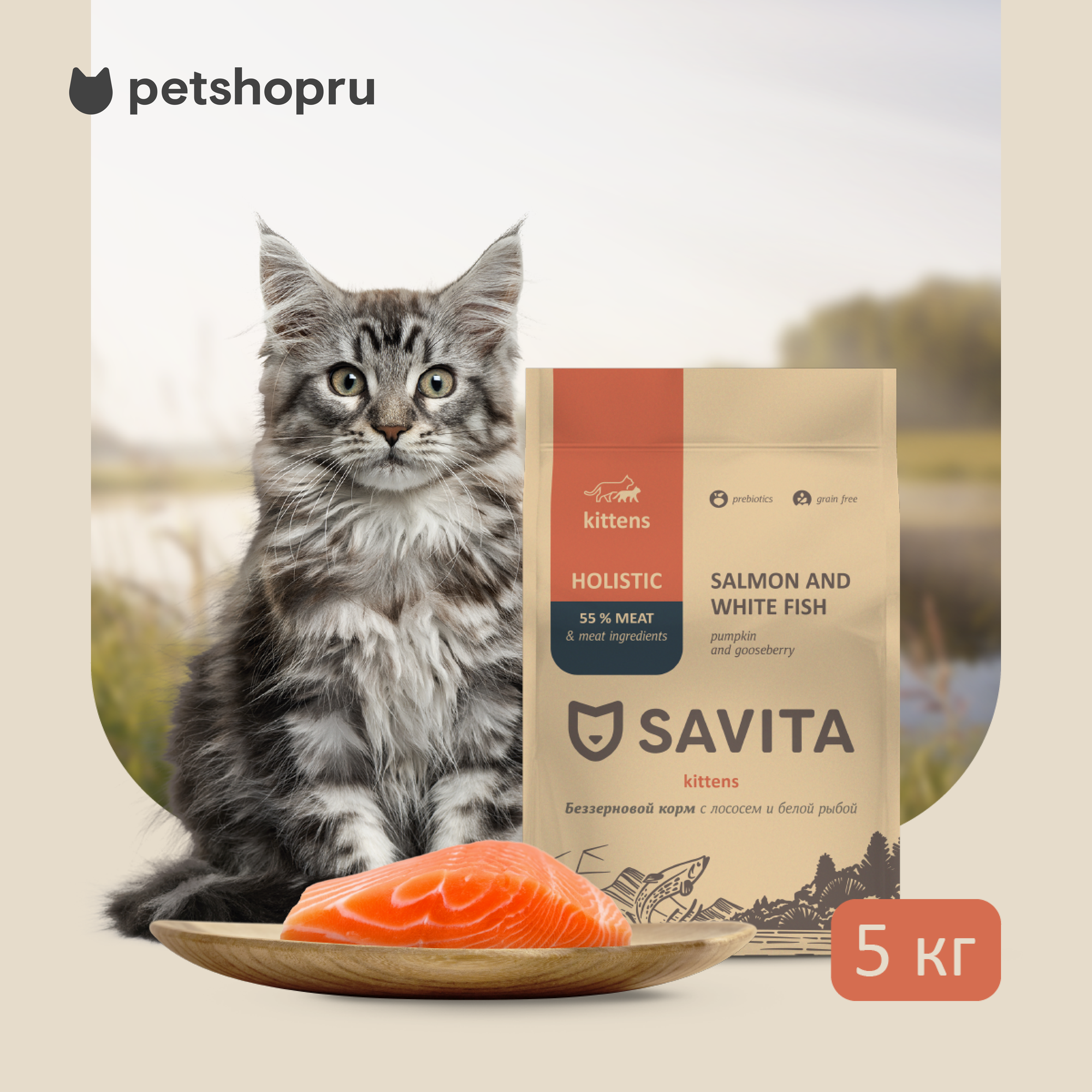 Беззерновой корм SAVITA для котят с лососем и белой рыбой, GRAIN FREE KITTEN, Salmon & White Fish, 5кг