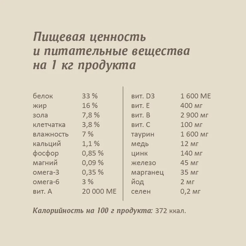 А также высокое содержание витамина А: 20000 МЕ. И витамина D: 1600 МЕ. Остальные ингредиенты тоже натуральные. Кошкам (18 лет и 4 года) очень понравился запах. Едят с удовольствием. Я его даю в смеси с другими кормами: делаю ассорти |