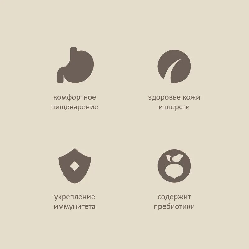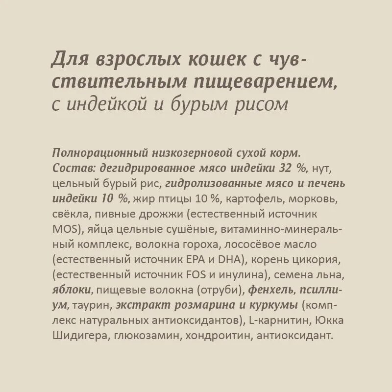 | Состав | мясо (в т.ч. индейка 30 %, кролик 8 %), картофель, зелёный горошек, жир индейки, витаминно-минеральный комплекс, пивные дрожжи ,цельное яйцо, пульпа сахарной свёклы, льняное семя, тыква, морковь , лососёвый жир,брусника, L-карнитин, ромашка, розмарин, цикорий, таурин, глюкозамин из животных тканей, сульфат хондроитина, юкка Шидигера |