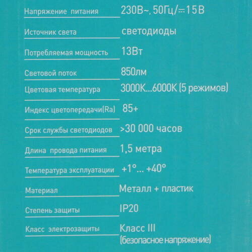 | Дополнительная информация | пять режимов цветовой температуры от 3000К до 6000К |