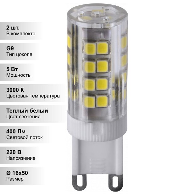 Купить (2 шт.) Светодиодная лампочка Navigator G9, мощность 5 Вт, напряжение питания 220-240 В, цветовая температура 3000 K, теплый белый свет, световой поток 400 Лм, цоколь G9, размер 16х50 мм, NLL-P-G9-5-230-3K