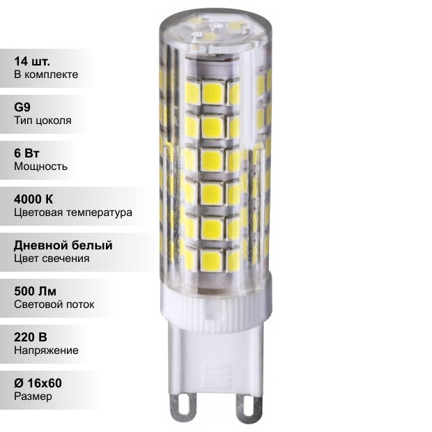 Купить (14 шт.) Светодиодная лампочка Navigator G9, мощность 6 Вт, напряжение питания 220 В, цветовая температура 4000 K, нейтральный белый свет, световой поток 500 Лм, пластик, цоколь G9, размер 15х60 мм