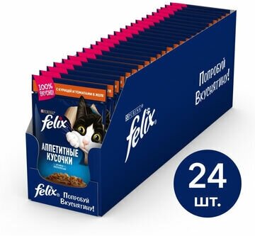 Купить Влажный корм FELIX Аппетитные кусочки для взрослых кошек, с курицей и томатами в желе, Пауч, 85 г, 24 шт