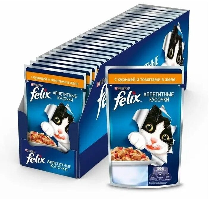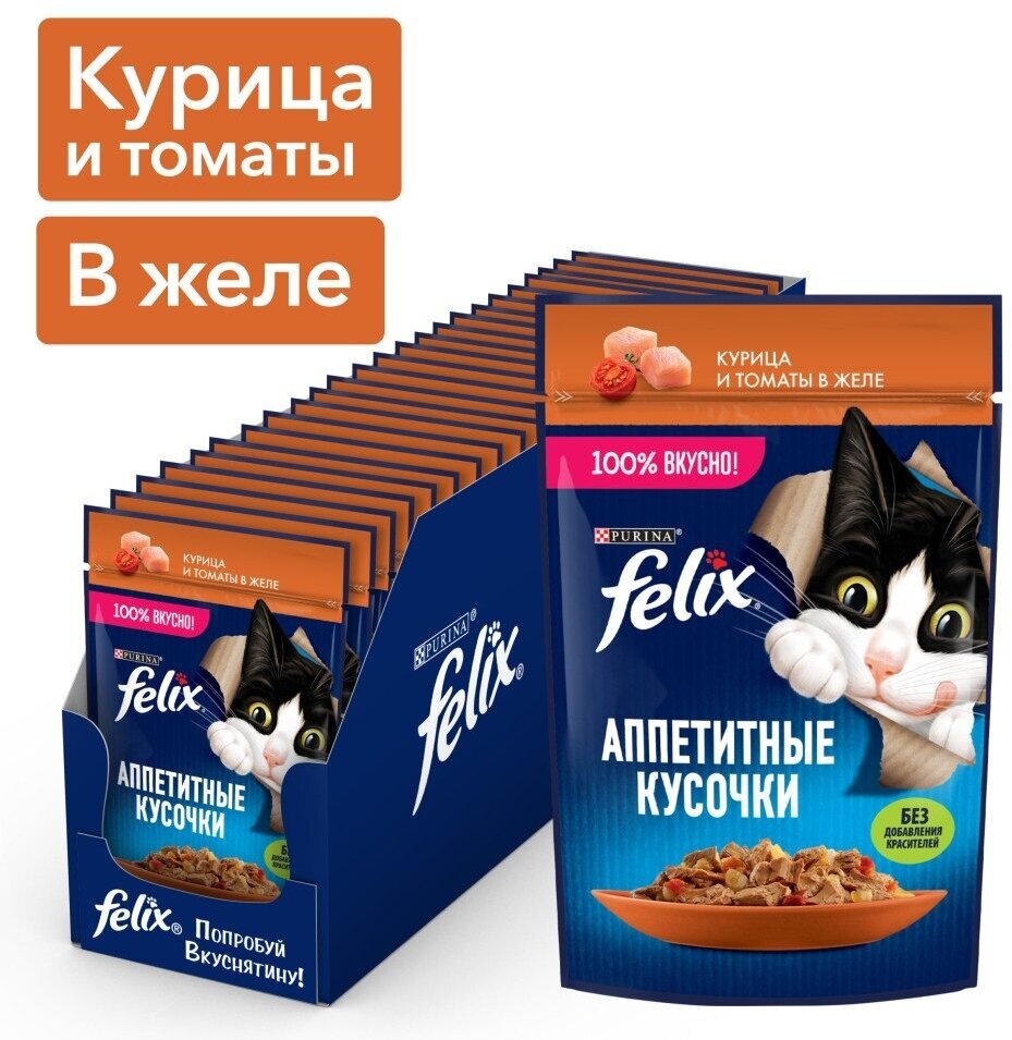 Корм для кошек FELIX Аппетитные кусочки с курицей и томатами в желе, пауч 85 г (упаковка - 26 шт)