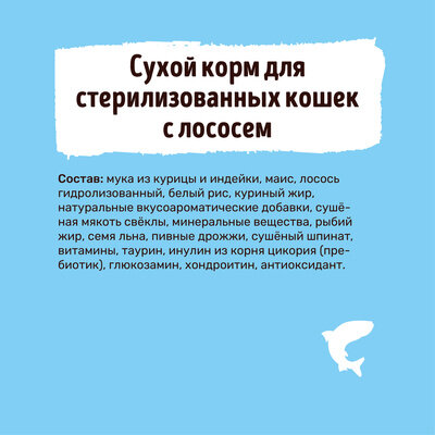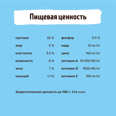 | Состав | мука из курицы и индейки, цельные злаки (маис), белый рис, растительный протеин, куриный жир, натуральные вкусо-ароматические добавки, сушёная мякоть свёклы, минеральные вещества, подсолнечное масло, рыбий жир, витамины (в т.ч. таурин), семя льна, пивные дрожжи, морские водоросли, инулин из корня цикория (пребиотик), глюкозамин, антиоксидант |