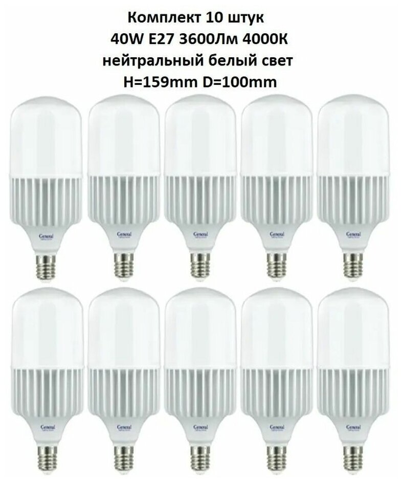 Светодиодные лампы, General, Комплект из 10 шт., Мощность 30 Вт, Цоколь E27, Дневной свет
