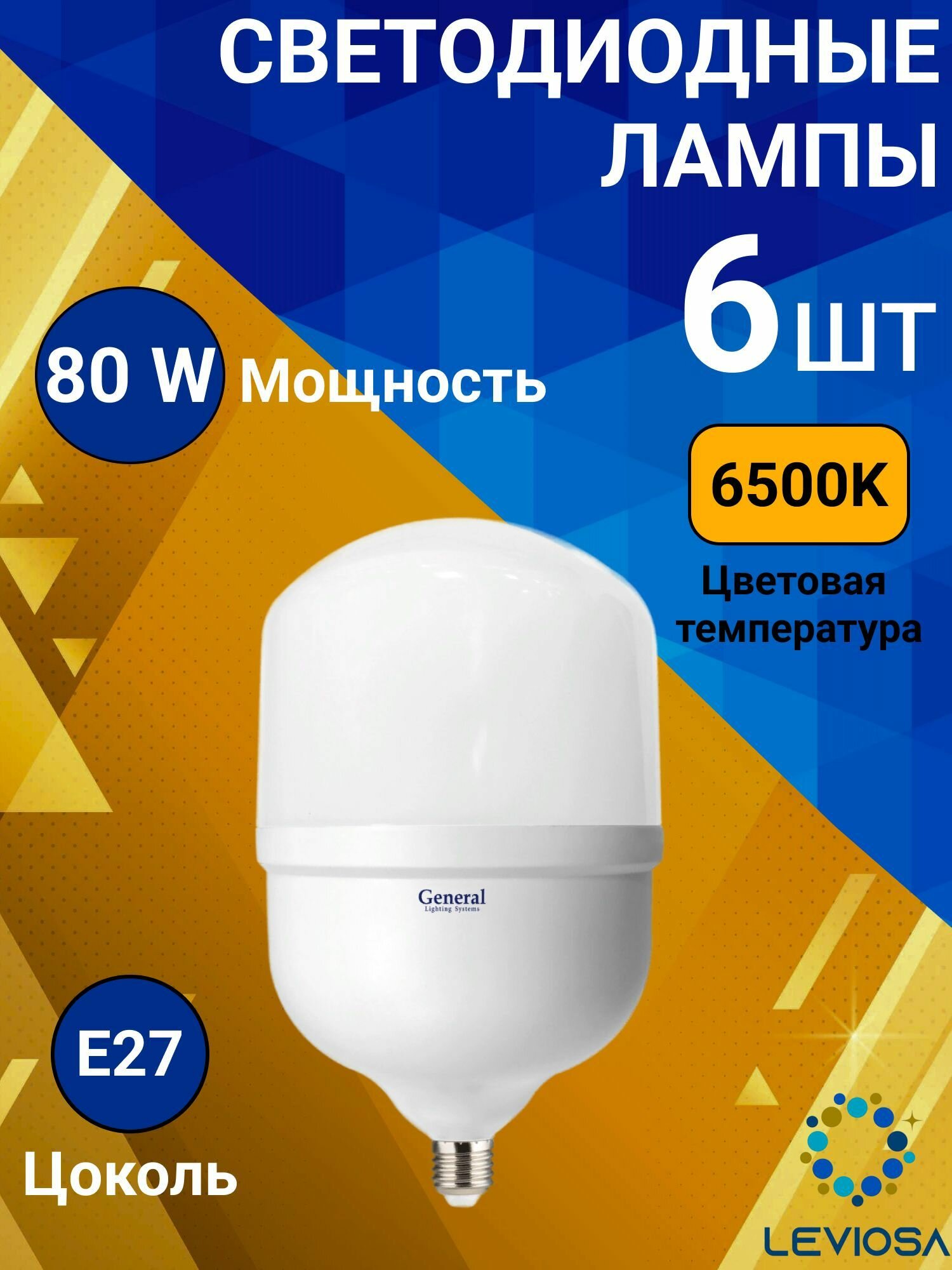 Светодиодные лампы, General, Комплект из 6 шт., Мощность 80 Вт, Цоколь E27, Холодный свет