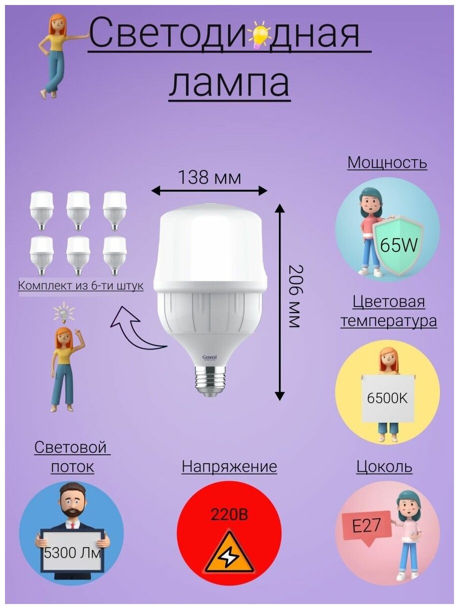 СохранитьЛампочка светодиодная, General, Комплект из 6 шт., 65 Вт, Цоколь E27, 6500К, Форма лампы Бочонок, HPL интересное: