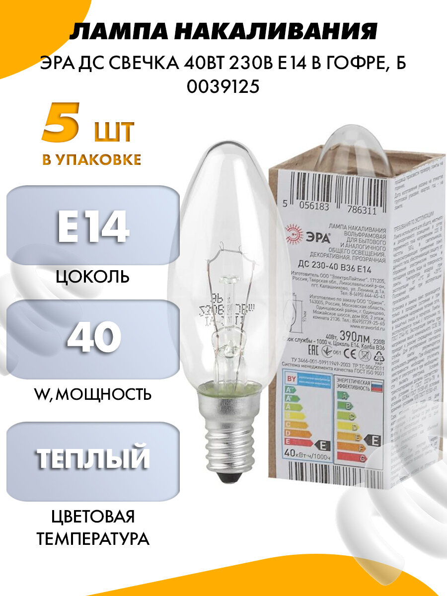 СохранитьЭРА Лампа накаливания ДС свечка 40Вт 230В Е14 в гофре, Б0039125 интересное:
