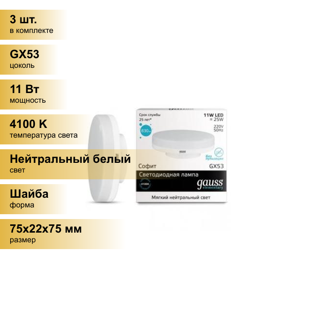 Купить (3 шт.) Светодиодная лампочка Gauss Elementary GX53 11W(830lm) 4100K 4K 75x22 матовая, пластик/алюм. 83821 Нейтральный белый. Цоколь GX53