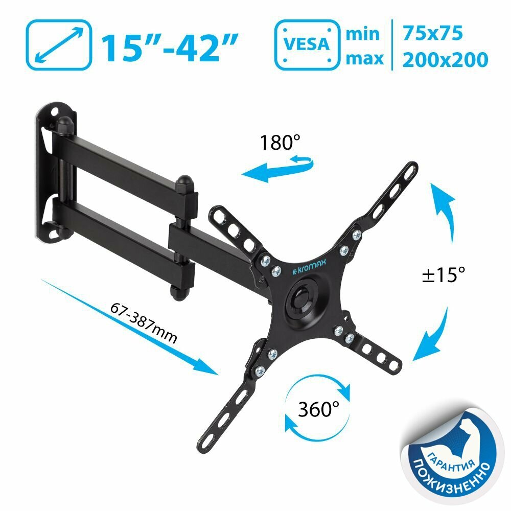 Кронштейн Kromax DIX-13 Black для LED/LCD TV 15"-42", max20кг, 5ст свободы, от стены 67-387 мм, max VESA 200x200 мм