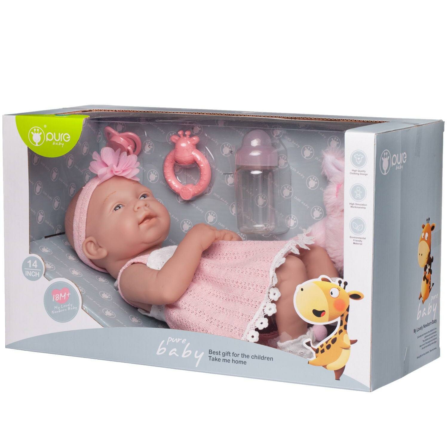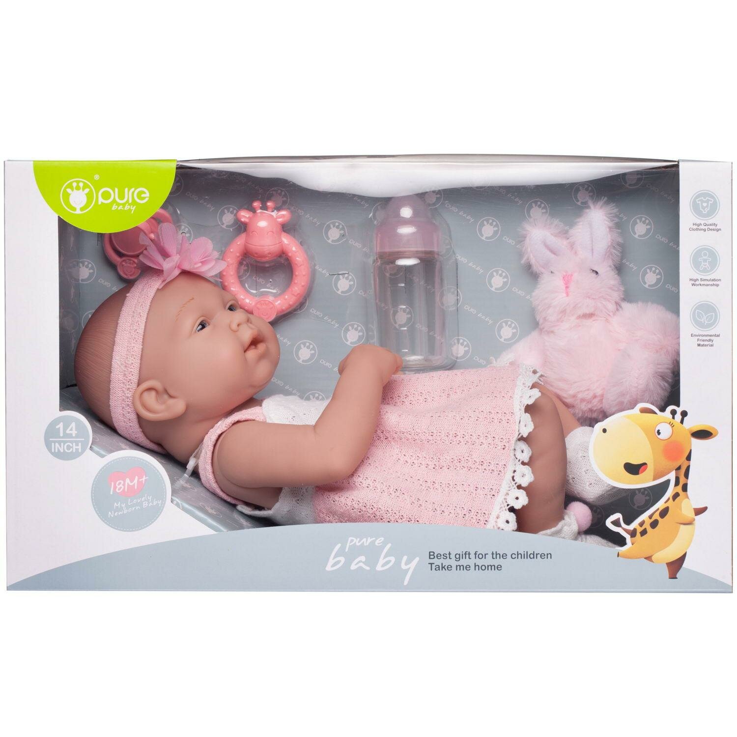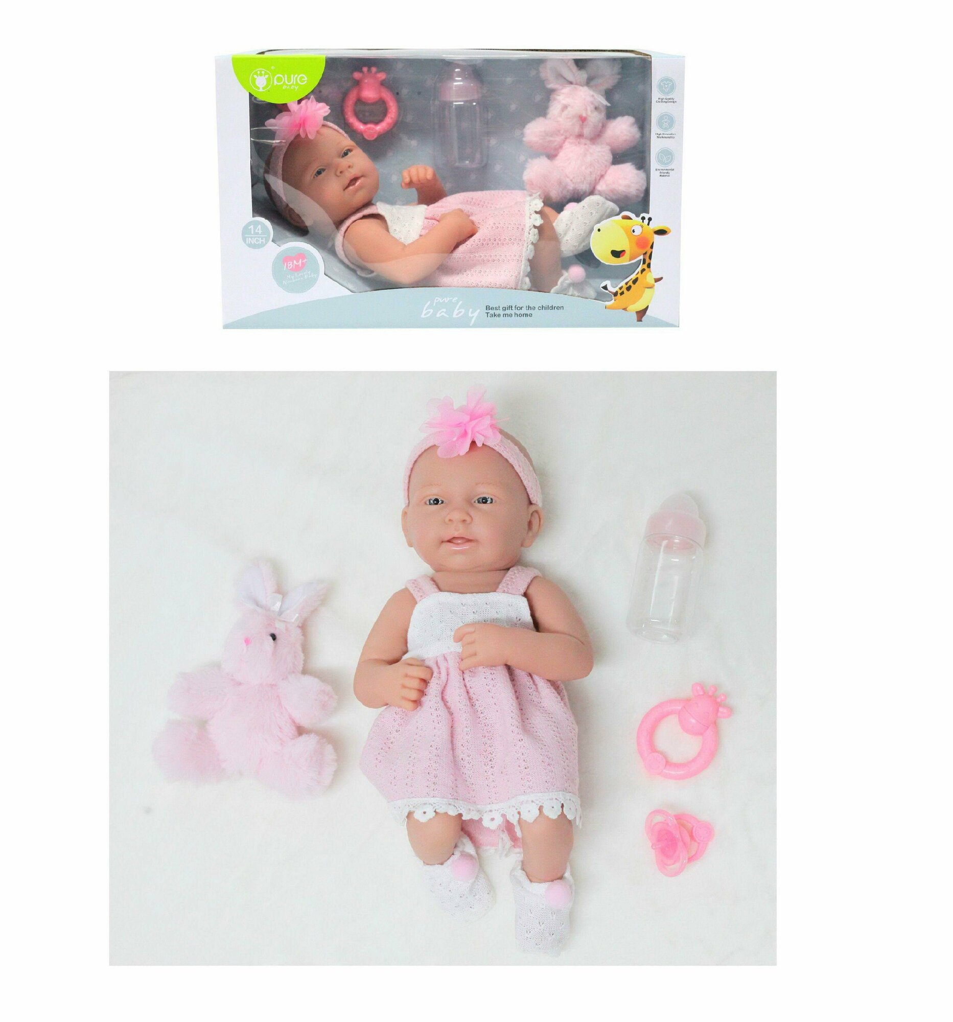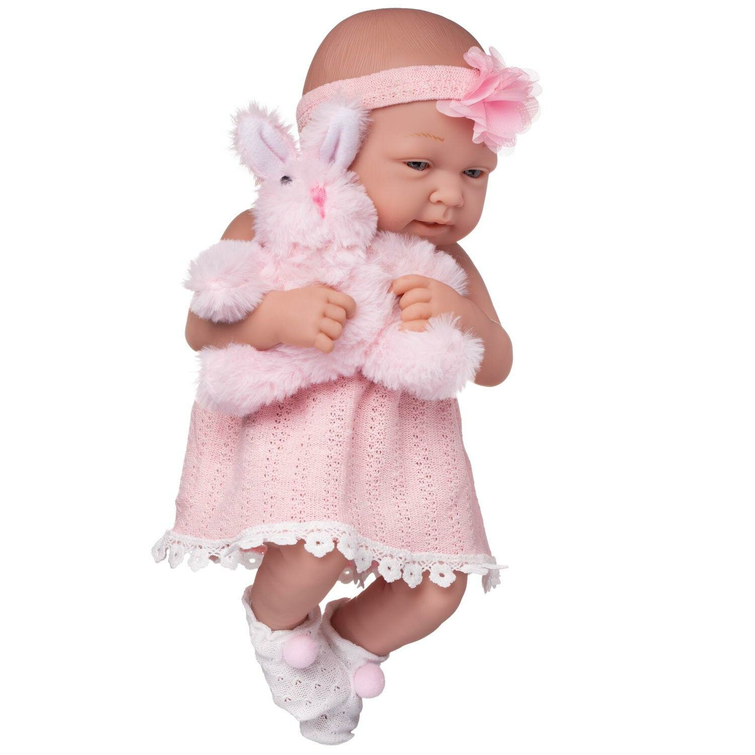 Пупс "Pure Baby", 35см, в ажурном бело-розовом платье, в белых пинетках, с повязкой на голове, в наборе с розовым плюшевым зайчиком и аксессуарами, в интересное: