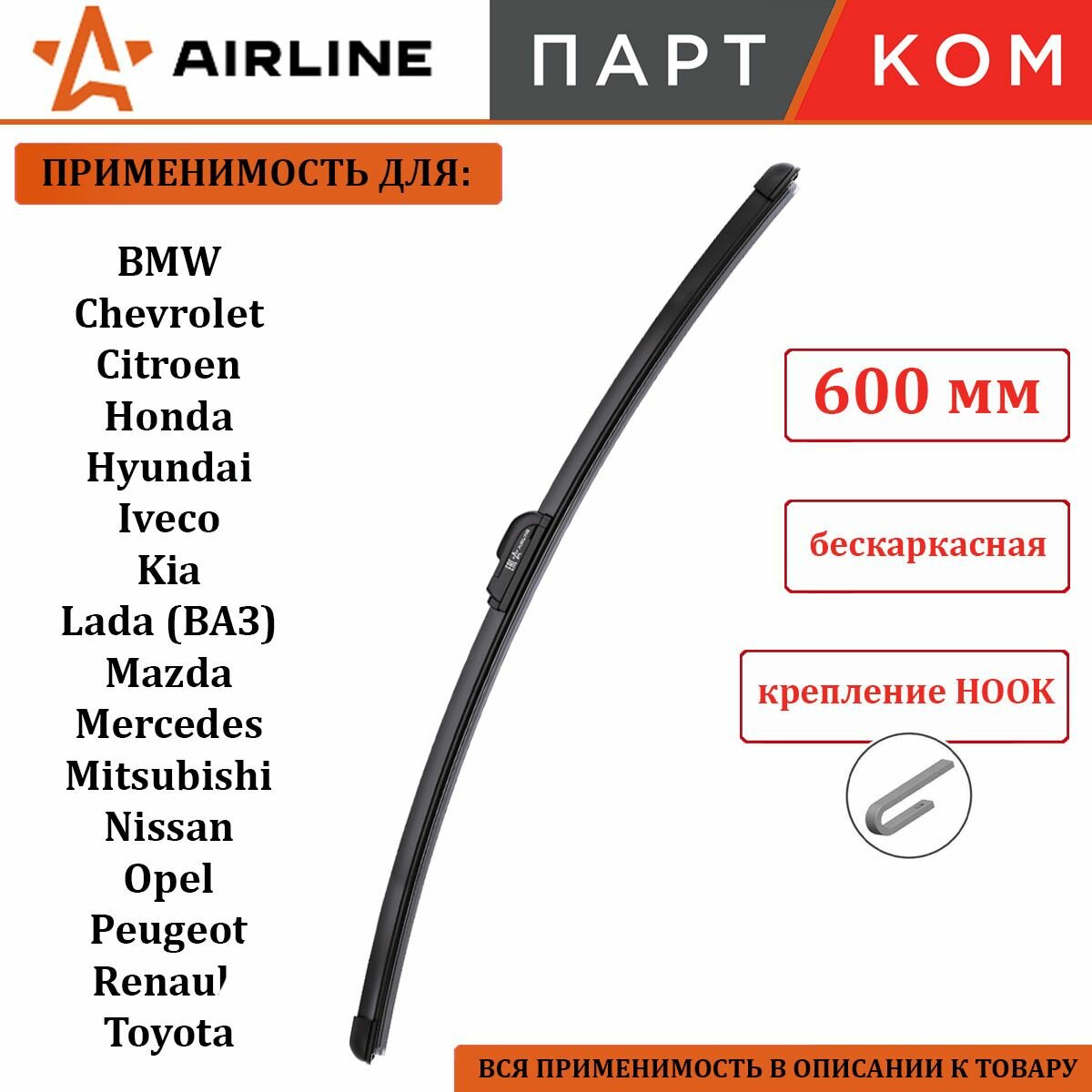 Щетка Стеклоочистителя 600мм (24) Бескаркасная, 1 Адаптер (Hook 9x3) AIRLINE арт. AWB-BKP-600