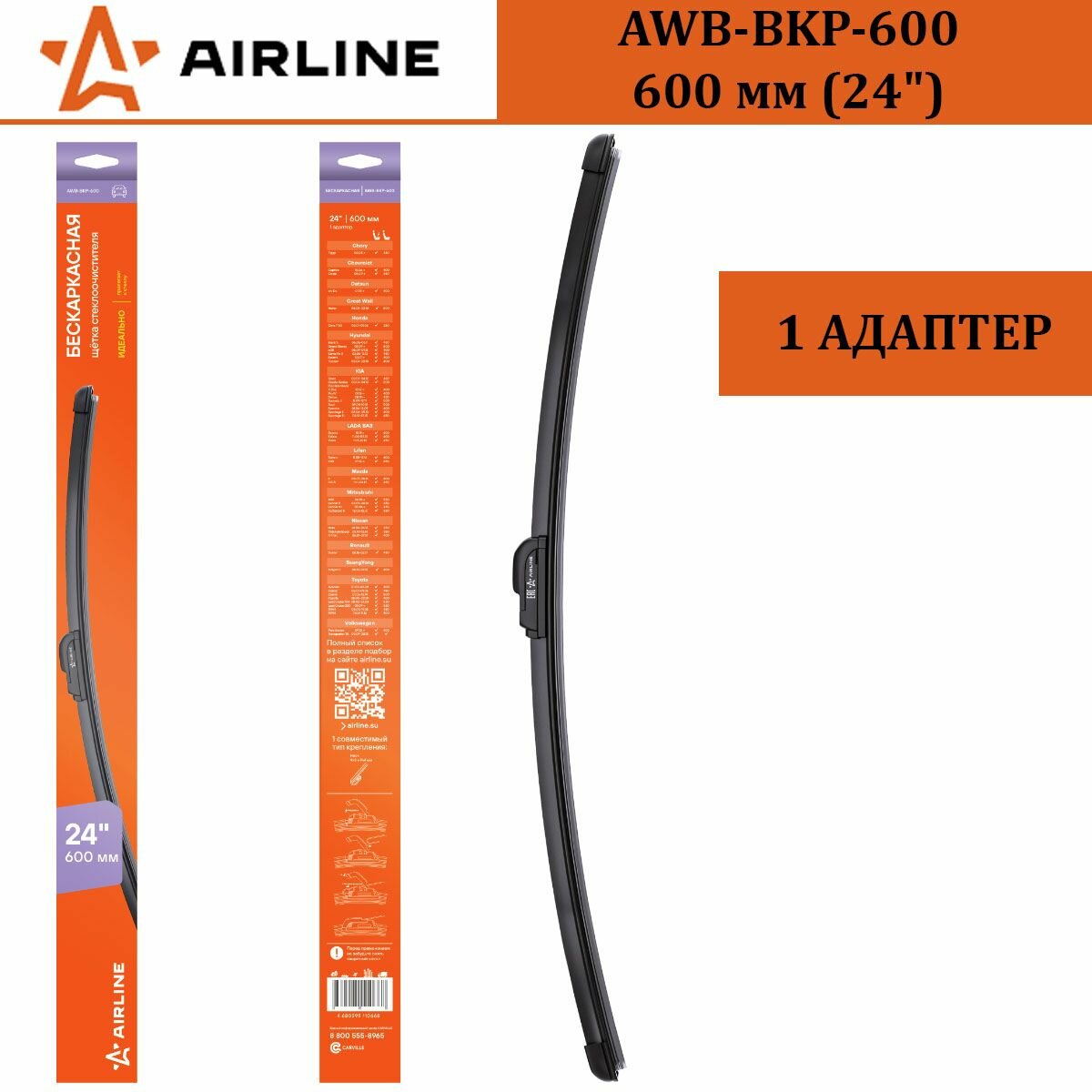 Щетка стеклоочистителя 600мм (24") бескаркасная, 1 адаптер (Hook 9x3, 9x4 mm - Крючок 9x3, 9x4 мм) AWB-BKP-600 AIRLINE