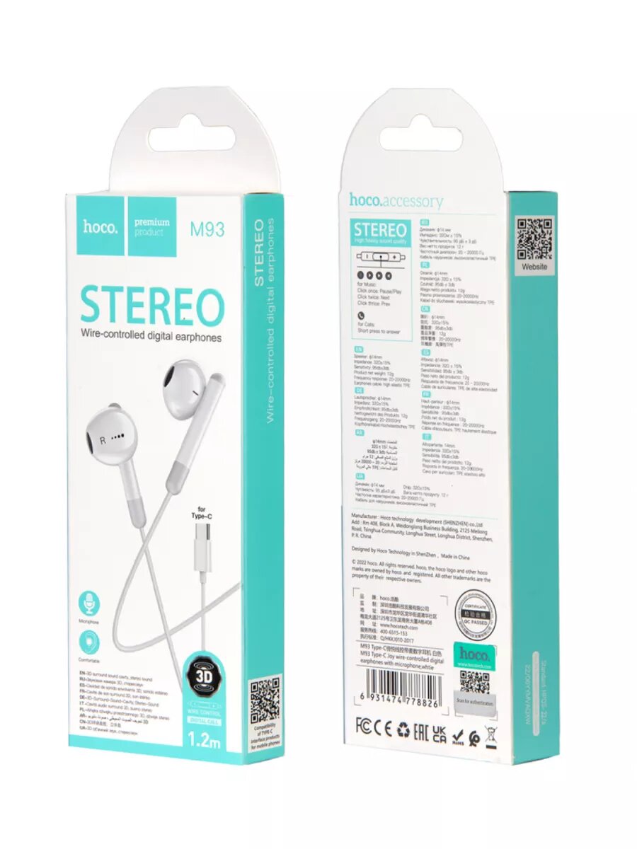 Наушники M93, Type-C, Wire control earphones with microphone, HOCO, белый