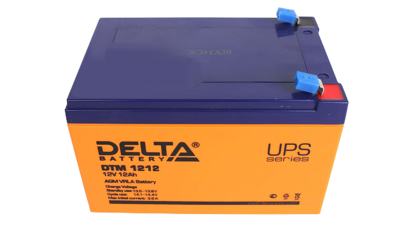 Батарея DELTA серия DTM, DTM 1212, напряжение 12В, емкость 12Ач (разряд 20 часов), макс. ток разряда (5 сек.) 180А, макс. ток заряда 3.6А, свинцово-кислотная типа AGM, клеммы F2, ДxШxВ 151х98х95мм., вес 3.8кг., срок службы 6 лет. Delta UPS DTM 1212 (12V