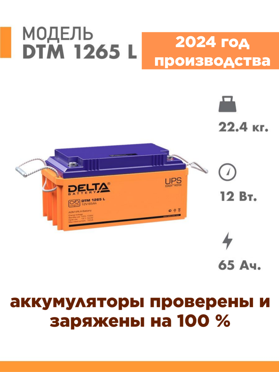Аккумуляторная батарея Delta DTM 1265 L 12В 65Ач AGM для ИБП, UPS, аккумулятор для детского электромобиля, кресла-каталки