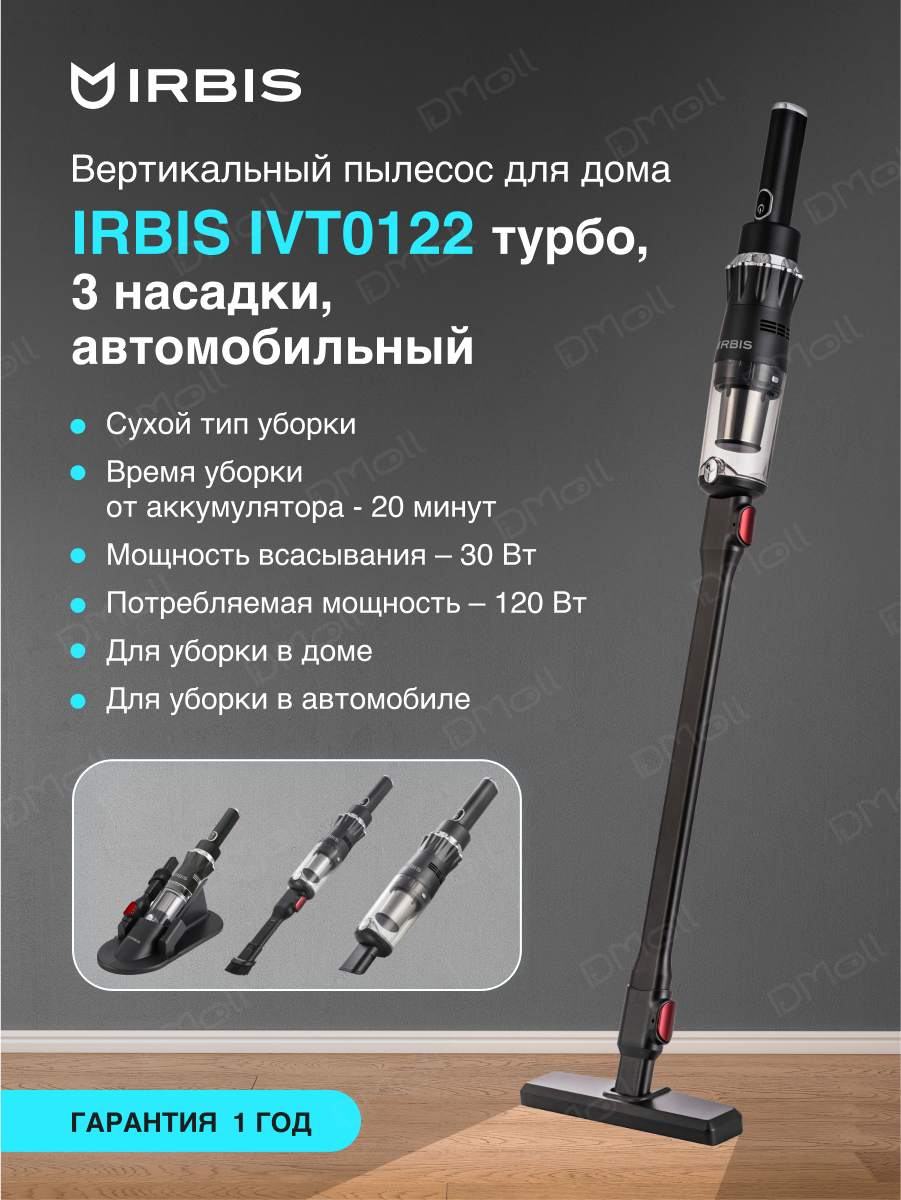 Купить Вертикальный пылесос для дома IRBIS IVT0122 турбо, 3 насадки, автомобильный