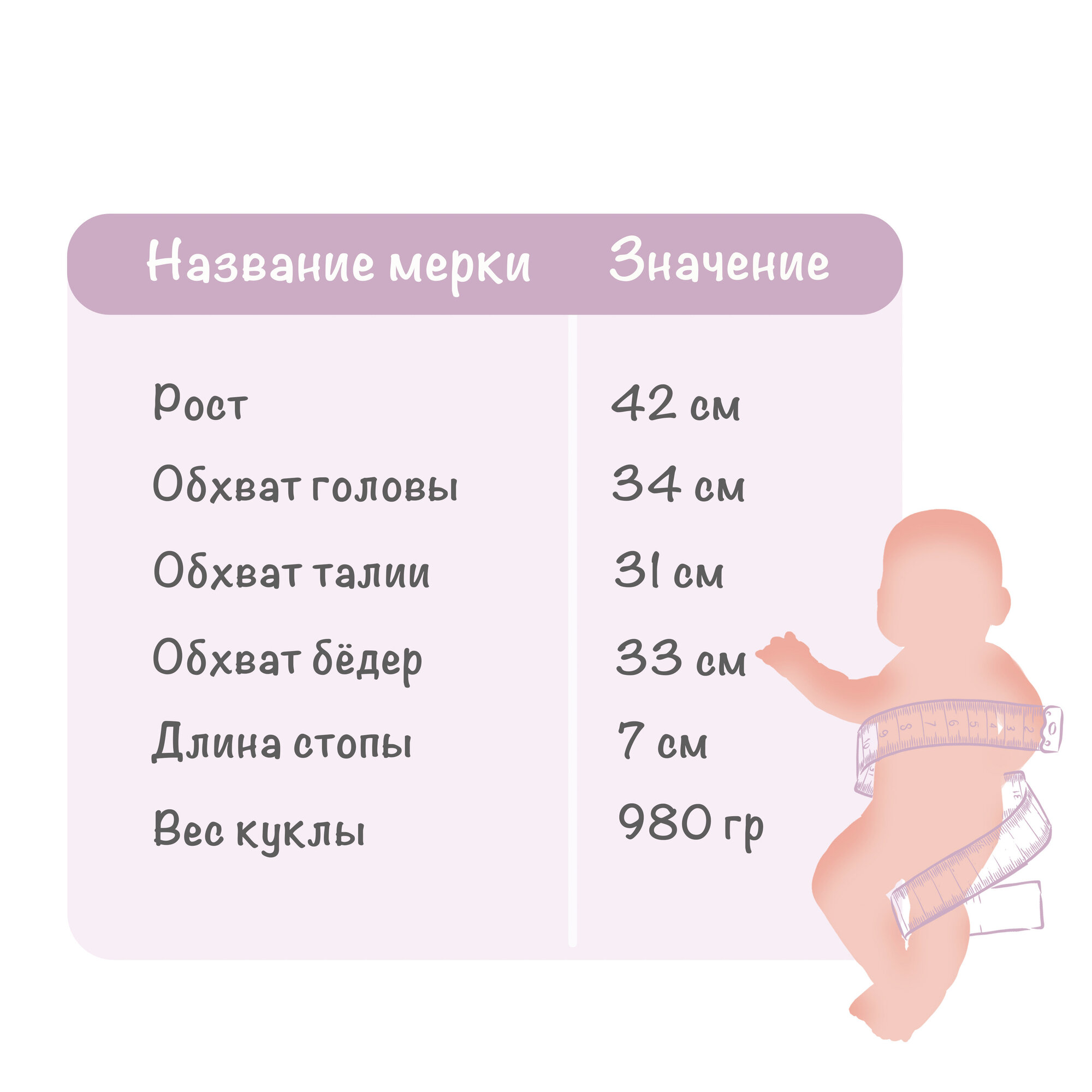 | Комплектация | кукла, шапка, костюм, носки, одеяло, соска |