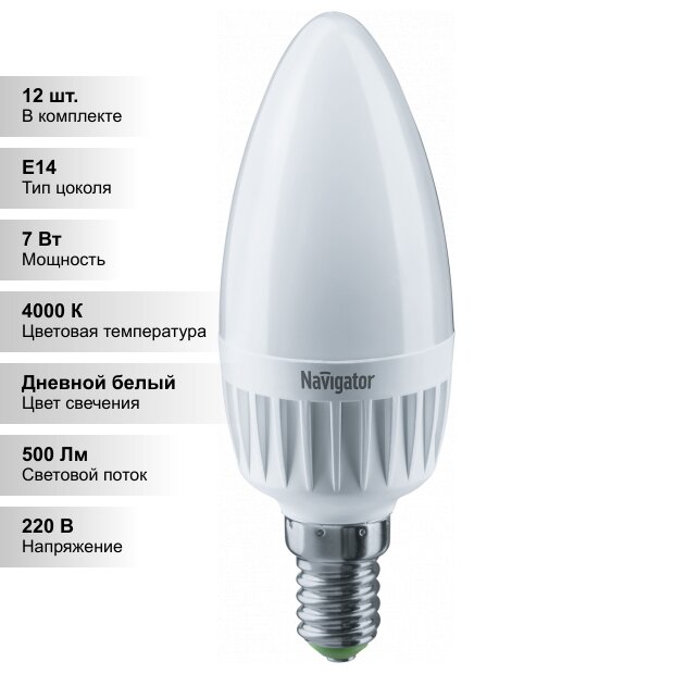 Купить (12 шт.) Светодиодная лампочка Navigator C37 7Вт 230В 4000K E14