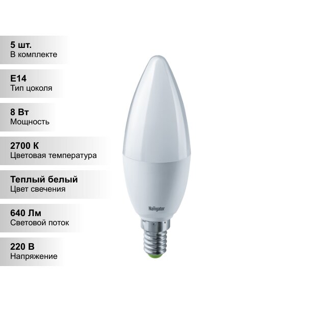 Купить (5 шт.) Светодиодная лампочка Navigator C37 8.5Вт 230В 2700K E14