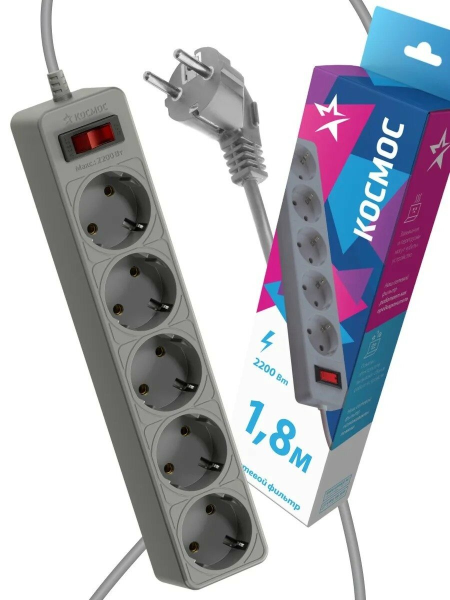 Сетевой фильтр Космос Электро Космос 5х1.8м с заземл. 10А IP20 2.2кВт 3х0.75 индик. сети, серый, FKsm1.8m-5g(G)